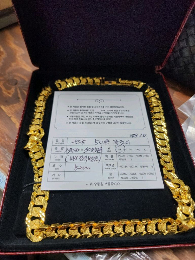 순금50돈 목걸이팝니다 길이52cm 케이스,보증서O 실착용횟수가 많지않아 잔기스 거의 없이 깨끗하고 세공비 많이 들어갔습니다. 강원태백에서 직거래하며 순금실중량50돈 18k 0.75돈 포함 4700입니다 전액 현찰 찾아서 오셔야되구요. 금은방에 잘 모셔두고있으니 금은방에서 진위여부 확인해드리고 판매진행합니다. 잡담하실분 연락하지마시고 딱 사실분만 연락주세요. 편하신 시간대 아무때나 연락주세요