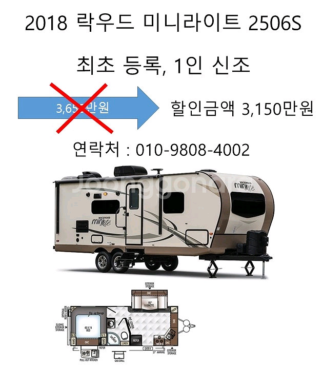 연락처 010-9808-4002 ㅁ 소개영상 ㅁ https://youtu.be/HGyAMagtNmU 전국배달가능합니다. 주행번호판 달려있습니다. 농막용도 가능합니다. 해가 바뀌기전에 팔기위해 3,650만원에서 500만원 내려서 3,150만원으로 인하합니다. 2018년식 출고후 장박위주로 생활했습니다. 냉장고 2개, TV 2개, 가스히터, 무시동히터, 순정에어컨, 전기겸용 가스온수기, 위성안테나, 태양광 CISG 340, 젤밧데리 400A, MPPT30A, 스웨이마스터, 무게분산히치 캠핑카 출고 후 사용하지 않아 판매합니다. 어닝천과 아웃트리거는 새제품으로 교체해 놓았습니다