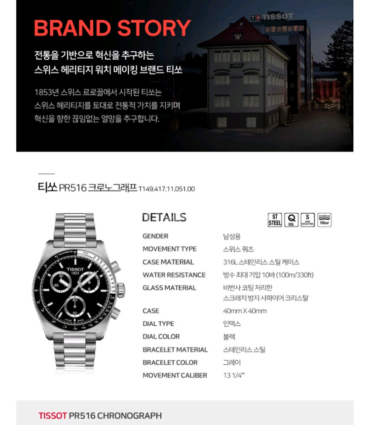 45 -> 40 -> 37가격 내렸습니다 25년 중순 70만원대 구매 후 관상용으로 실착 3회 미만이고 보관했습니다 미세기스도 거의 없습니다 시간 잘 맞구요 티쏘 정품 레이싱 디버클 스트랩도 동봉입니다 ~ PR516 40mm 100미터 방수 크로노그래프 쿼츠
