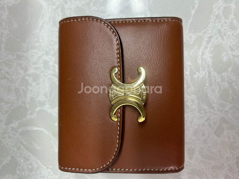 셀린느 트리옹프 반지갑입니다 - 색상: 브라운 - 소재: 램스킨 - 크기: 10.5 x 8.5 x 4 cm 카드 슬롯이 5개 있어서 수납이 용이하고, 트리옹프 메탈릭 스냅 버튼 잠금장치가 포인트입니다 꼼꼼하게 마감되어 고급스러운 느낌을 줍니다 다만, 사용감으로 인한 스크래치가 약간 있습니다(사진 참고) 탄 컬러는 가격이 더 나가구 구하기힘들었습니다! 다른 브랜드의 지갑을 구매하게되어 판매합니다! 이사로 인해 보증서나 풀 박스는 없습니다ㅠㅠ (구매 영수증으로 보여드리기 가능)