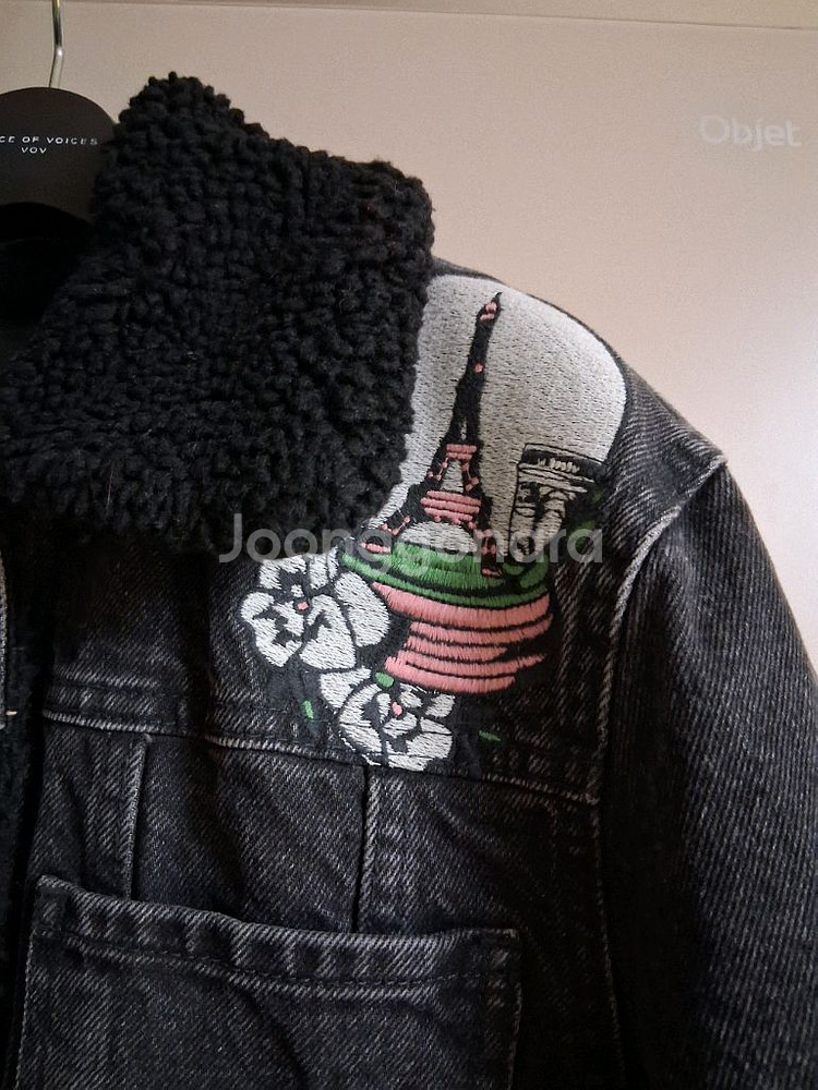 maje마쥬 뽀글이배색 블랙데님 자켓 도톰한 두깨감입니다 카라와 밑단등 뽀글이가 두툼하게 배색도어 있어요 자수가 포인트로 들어가 멋스러워요 시착하고 보관만한 옷입니다 사이즈36 가슴반품50 총장54
