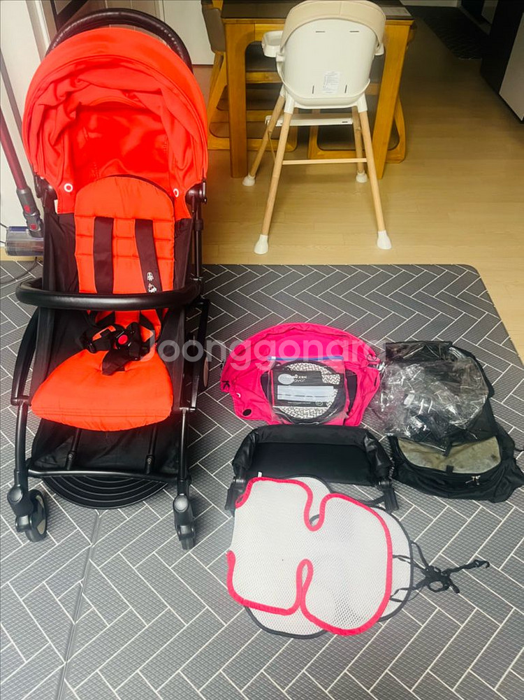 베이비젠 요요6 플러스 유모차입니다. 색상은 컬러팩 포함 핑크,레드/블랙 조합입니다. 색상은 레드 블랙 색상으로 유모차 본체장착 되어있고 핑크 컬러팩도 추가로 가지고 있습니다 손잡이 / 안전바 둘다 가죽커버 추가 구매해서 씌어져있고 발받침도 추가 구매해서 안전바에 장착해서 사용가능합니다. 발받침은 돌전부터 사용할때 좋아요 그래서 밑에 안전바 위에 안전바2개 입니다. 레인커버는 부가부 꺼 사이즈 얼추 맞아서 겸용으로 사용하였고 레인커버 블랙도 있어요 여름용시트 블랙 레드 시트 있고 추가 가릴수 있는 햇빛가리개 있습니다 전체적으로 깨끗하게 사용했지만 사용감은 있어요 중고인점 감안해서 구매해주세요 비대면 보시고 구매도 가능합니다 파주운정2동 반품 환불 X
