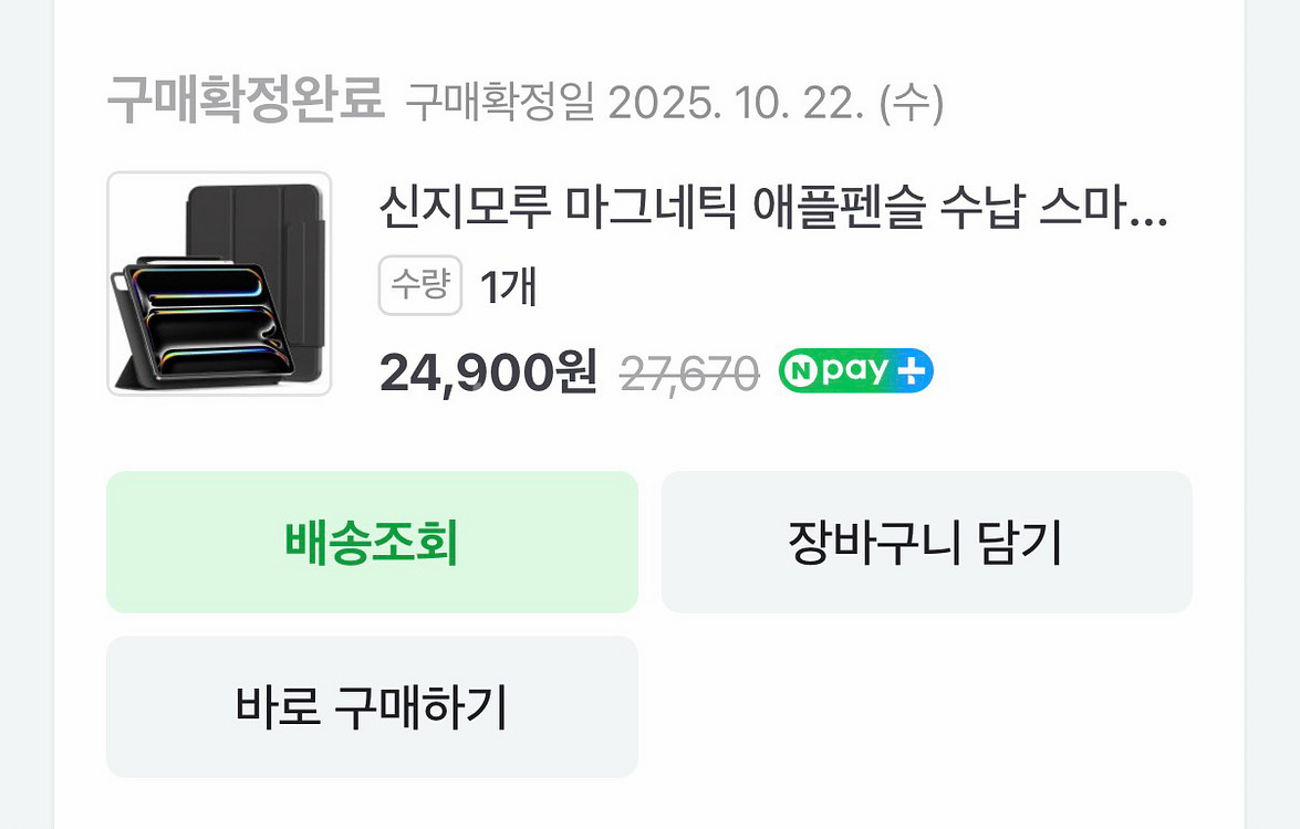 제품명: 신지모루 마그네틱 애플펜슬 수납 스마트 플랫커버 케이스 블랙 구매일: 25.10.22 제품상태: 새것과 같음 제품 모델 사이즈를 잘못 구매해서 판매합니다.