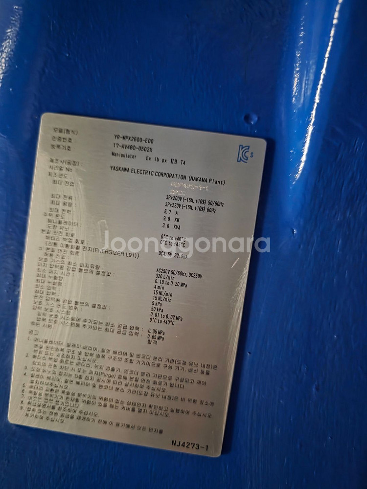 제품명: YASKAWA 산업용 로봇 (Manipulator) 모델명: YR-MPX2600-E00 컨트롤러 모델: YR-AV480-0502X 제조사: YASKAWA Electric Corporation (Nakama Plant) 제조국: 일본 (JAPAN) 용도: 도장용 산업용 로봇 (Explosion Proof Type)