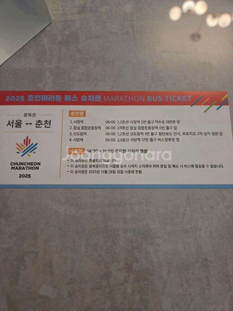 춘천마라톤 버스티켓 거래합니다 택배거래만 가능합니다 제가 대전살아서 오늘 대전에서만 직거래 가능하면 채팅주세요