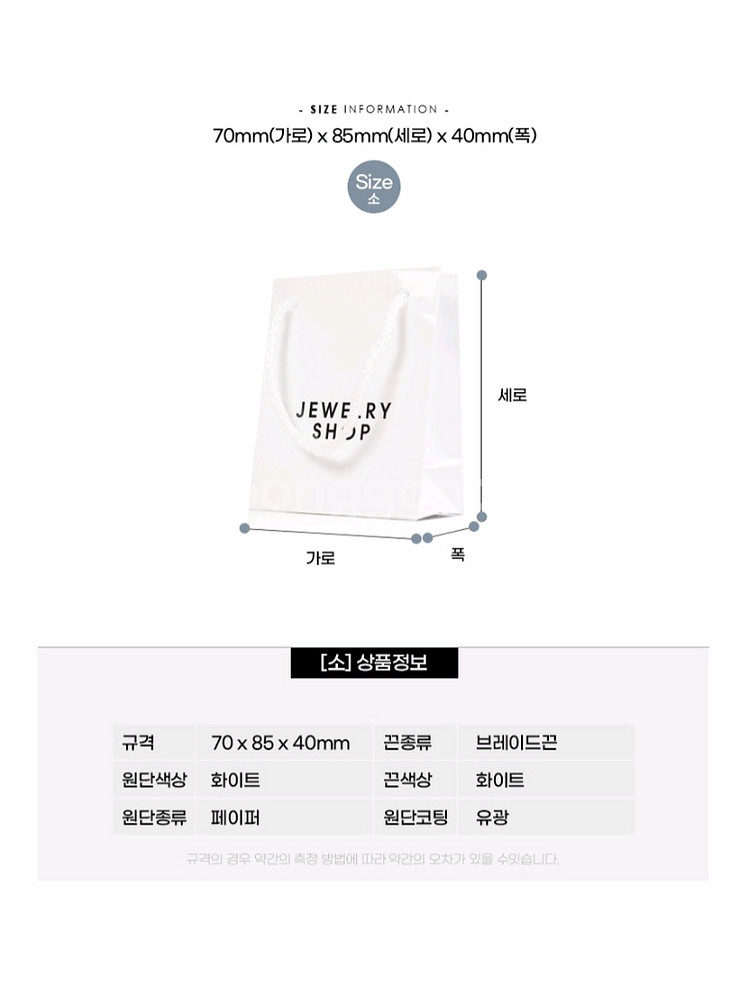 쥬얼리나 골드바를 넣는 쇼핑백 판매합니다 쇼핑백 대 사이즈 사이즈 약 가로12 세로 19 10장에 5000원에 판매합니다 1장당 500원 중 쇼핑백 사이즈 약 가로10 세로 약14 10장 3000원 1장당 300원 소 쇼핑백 사이즈 가로 약7 세로 약8.5 10장 3000원 1장당 300원 입니다