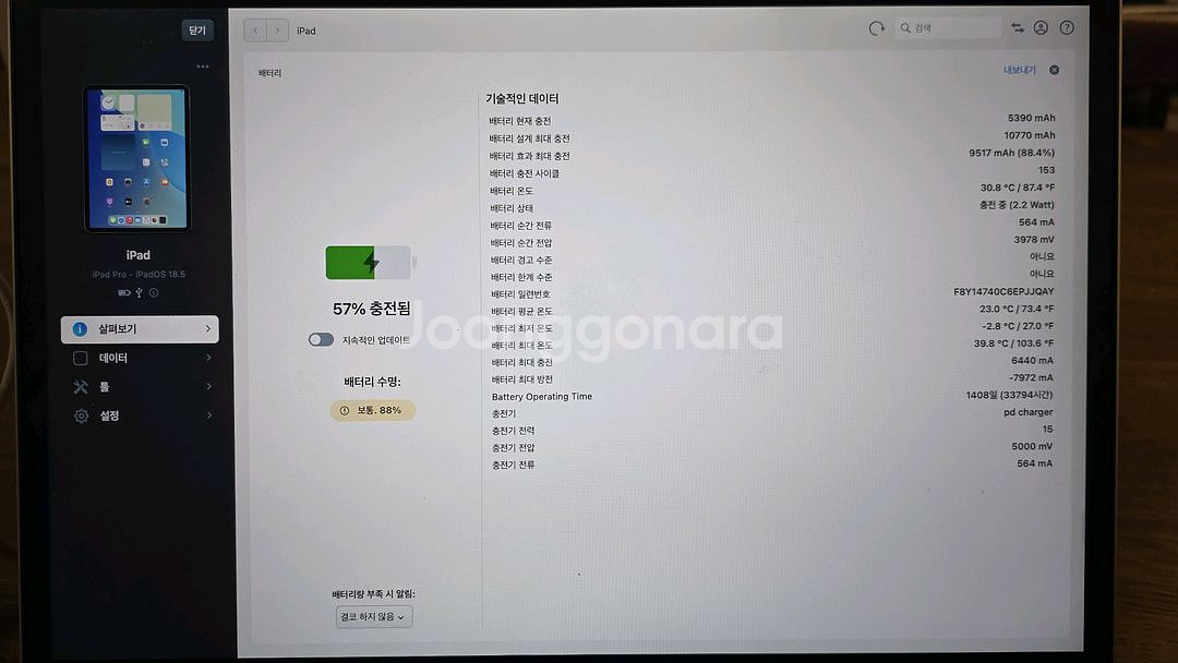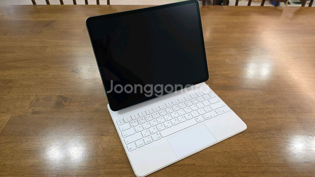 아이패드 프로 12.9 5세대 Wi-Fi 128GB + 정품 매직키보드 (화이트) 코로나 시기에 구입해서 외출용으로 들고 다니며 사용한 적은 없고, 거의 대부분 집 안에서만 사용한 제품입니다. 주로 와이프가 가정용으로 간단히 사용했기 때문에 전체적으로 사용감이 거의 없고, 정품 매직키보드의 타이핑감도 오래 사용한 제 키보드와 비교하면 신품 수준으로 탄탄합니다. 아이패드 본체 역시 액정 깨끗하고 기능 이상 없습니다. 가까이서 보면 키보드 겉면에 살짝 립스틱 자국처럼 보이는 흔적이 있지만, 멀리서 보면 거의 티 나지 않고 테이블 위에서만 사용해서 바닥면도 깔끔한 편입니다. 정품 충전기도 있습니다. iCloud 로그아웃 및 초기화 완료했습니다. 직거래는 이천시 장호원 인근에서 가능하며, 택배 거래도 가능합니다. 배터리 성능도 첨부한 사진에 보면 맥북을 연결하여 확인한 내용 나와있습니다. (25년 10월 23일 기준) 직거래 이천 장호원입니다. 세트 판매가: 1,200,000원 (아이패드 + 정품 매직키보드 포함) O1O 구오오사 8O3O