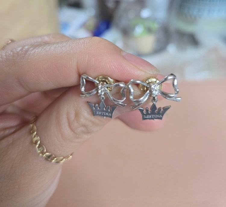 14k 제이에스티나 화이트 골드 귀걸이이예요. 리본 모양에 왕관모양이 달려있는 귀여운 디자인이구요. 착용하면 더 러블리한귀걸이예요.계좌거래나 페이가능