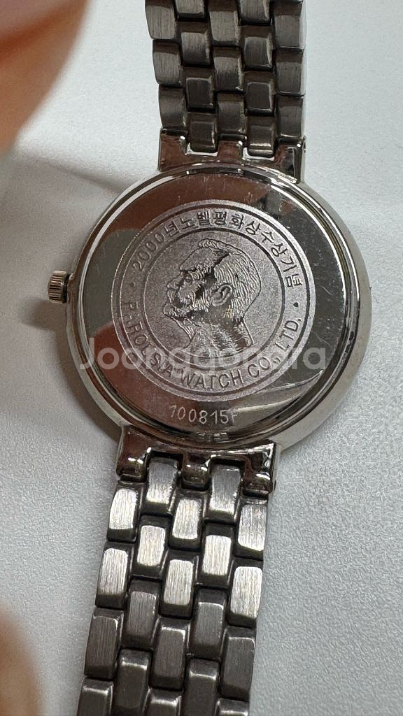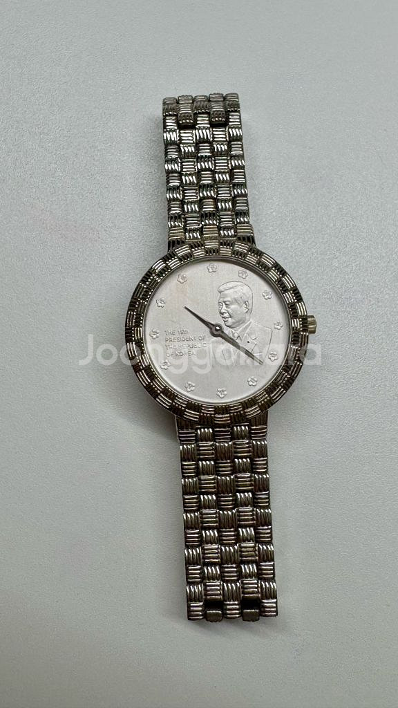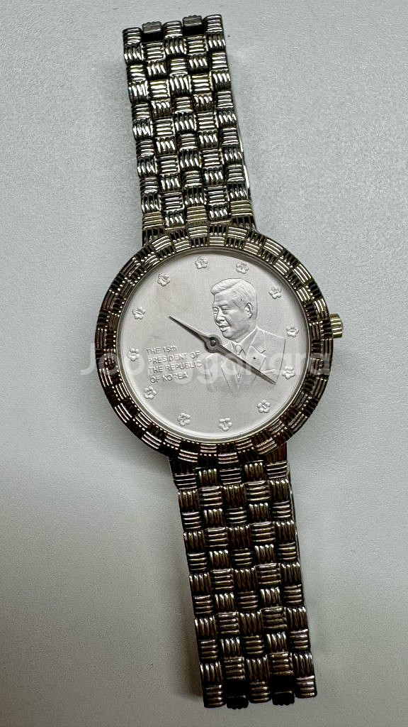 2000년 김대중 대통령의 노벨평화상 수상을 기념해 만들어진 공식 기념 시계예요. 당시 한정판으로 제작돼 지금은 보기 힘든 귀한 시계여서 소장용으로도 가치가 높습니다! 상태 좋고, 최근에 배터리도 갈아서 정상 작동합니다. 실버 메탈 바디에 18K 골드 용두가 적용되어 은은한 포인트가 아주 고급스럽고 세련된 느낌이에요. 시계 안쪽은 무궁화 문양으로 시간 표시가 되어 있어서 의미도 깊습니다 🌸 제품 특징 • 초박형 스위스 무브먼트 사용 • 사파이어 글라스 채용으로 스크래치에 강함 • 특수공법 0.35T 초박형 문자판 • 18K 골드 용두 포인트 • 전면에 김대중 대통령 초상, 후면엔 노벨 초상 각인 • 개별 시리얼 넘버 부여 (평생 A/S 가능) 사용 시 주의 • 심한 충격은 피해주세요 • 물에 직접 닿게 하거나 물이 묻은 상태에서 용두를 조작하지 마세요
