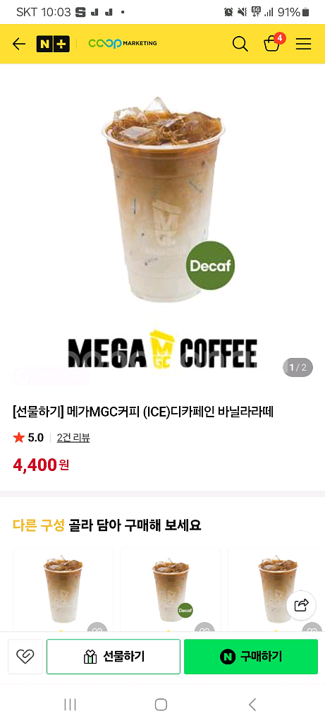 1. 메가커피 디카페인(ICE) 바닐라 라떼 2. 금액: 3.300원 (정가: 4,400원) 3. 유효기간: 2025.11.14 4. 연락처: ***-****-**** 5. 입금 즉시 MMS로 보내드리겠습니다.상품 정보 내 개인정보는 자동 보호됩니다. 안심결제로 안전하게 거래하세요.