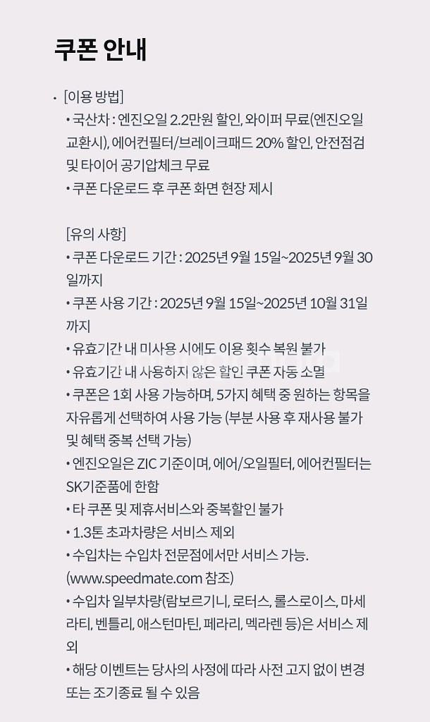 스피드메이트 엔진오일 2.2만원 할인쿠폰 사용기간 25년10월31일까지