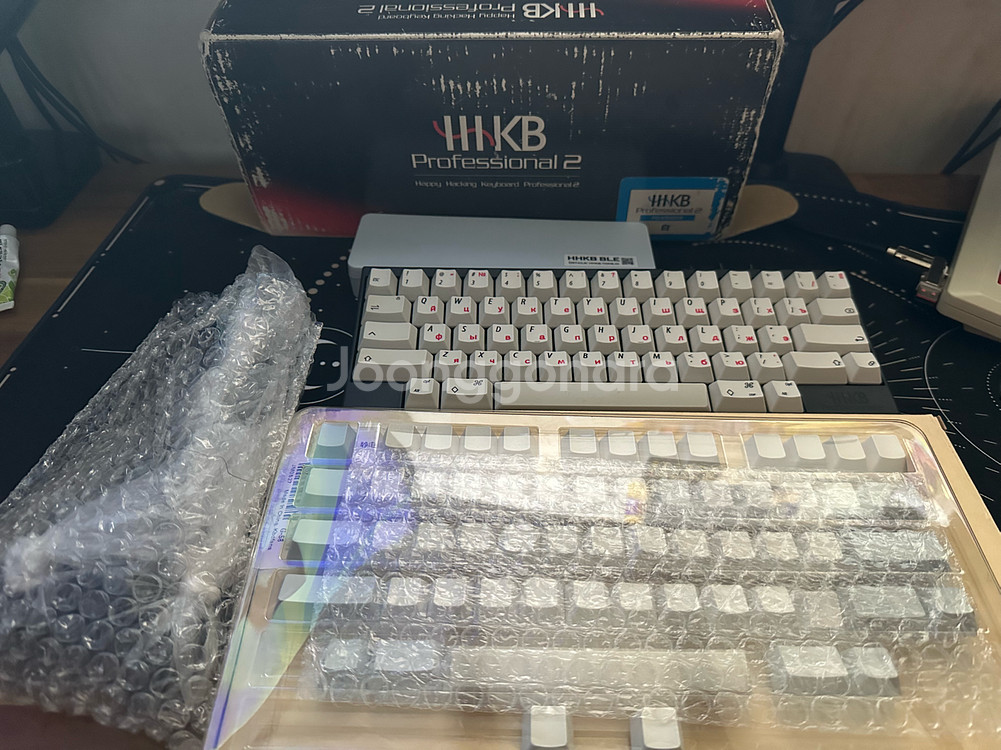 해피해킹 프로페셔널2 흑유각 입니다 블루투스 모듈 장착되어있어서 c타입 연결 및 via, vial 사용 가능합니다 흑유각 키캡과 그리스어키캡, 백무각 키캡 총 키캡 3개세트입니다 키보드는 분해 후 윤활 진행해서 도각도각 소리 정말 좋습니다 근 몇년간 이 구성으로 나온 매물 없을겁니다 눈물 머금고 내놓아요