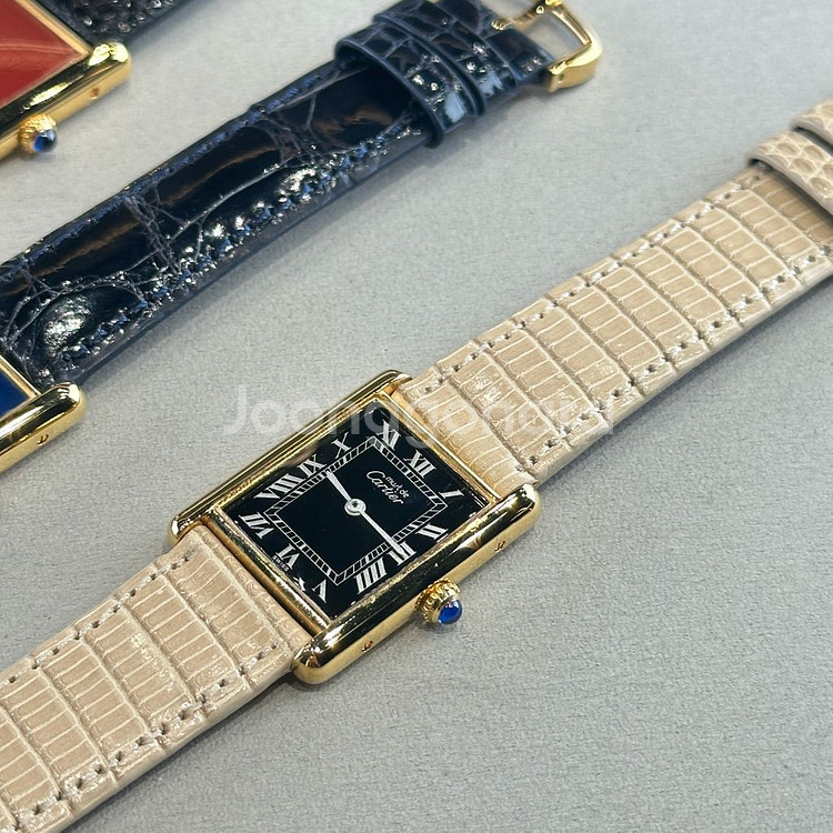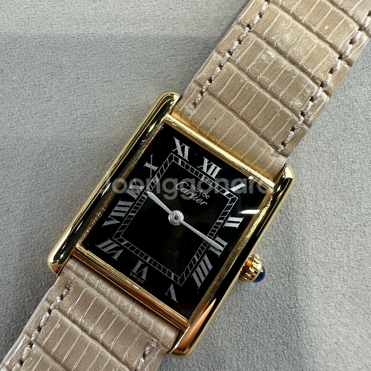 까르띠에 탱크 Must de Cartier Tank Vermail 925 라지 사이즈 LM 사이즈 라지 LM 23.5mm * 30mm 무브먼트 수동 (쿼츠가 아닌 수동은 매우 귀합니다! 기존 매뉴얼로만 생산되던 것을 대중화를 위해 쿼츠로 바꾼 것이기 때문 입니다.) 케이스 버메일 (92.5% 은인 스털링 실버에 18K 도금 - 기존 골드로만 생산되던 것을 대중화를 위해 골드 도금으로 변경한 것이 머스트 드 탱크 입니다) 다이얼 블랙에 실버 로만 다이얼