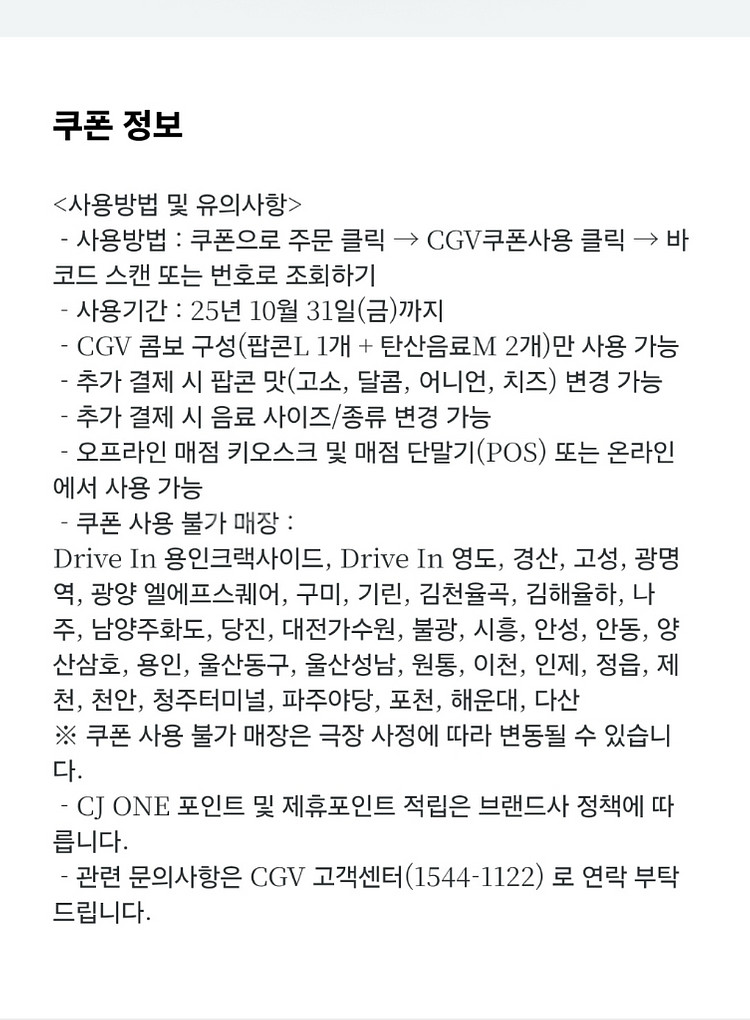 쿠폰 바코드 전송 후 환불 불가 사용기간 : 25년 10월 31일(금)까지 <사용방법 및 유의사항> - 사용방법 : 쿠폰으로 주문 클릭 > CGV쿠폰사용 클릭 > 바 코드 스캔 또는 번호로 조회하기 - 사용기간 : 25년 10월 31일(금)까지 - CGV 콤보 구성(팝콘L 1개 + 탄산음료M 2개)만 사용 가능 - 추가 결제 시 팝콘 맛(고소, 달콤, 어니언, 치즈) 변경 가능 - 추가 결제 시 음료 사이즈/종류 변경 가능 - 오프라인 매점 키오스크 및 매점 단말기(POS) 또는 온라인 에서 사용 가능 - 쿠폰 사용 불가 매장 : Drive In 용인크랙사이드, Drive In 영도, 경산, 고성, 광명 역, 광양 엘에프스퀘어, 구미, 기린, 김천율곡, 김해율하, 나 주, 남양주화도, 당진, 대전가수원, 불광, 시흥, 안성, 안동, 양 산삼호, 용인, 울산동구, 울산성남, 원통, 이천, 인제, 정읍, 제 천, 천안, 청주터미널, 파주야당, 포천, 해운대, 다산 ※ 쿠폰 사용 불가 매장은 극장 사정에 따라 변동될 수 있습니 다.