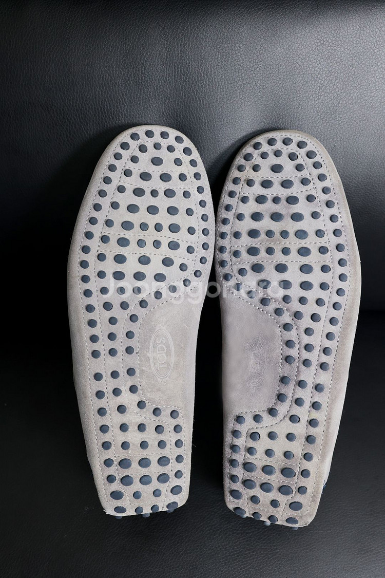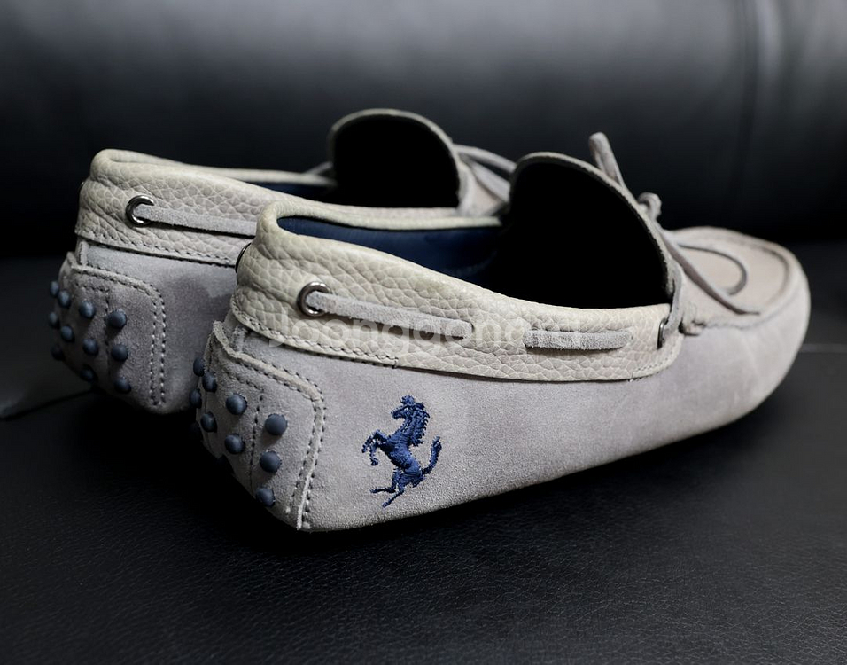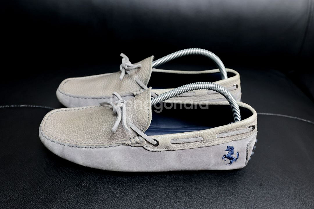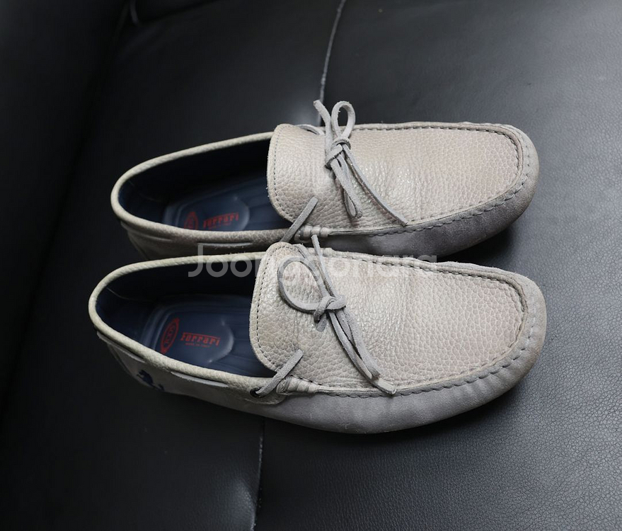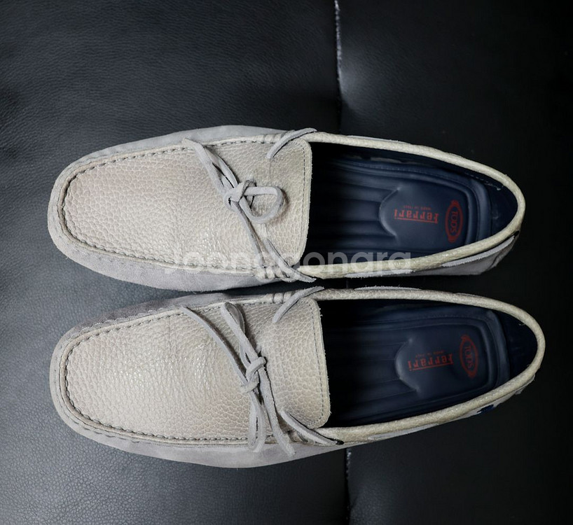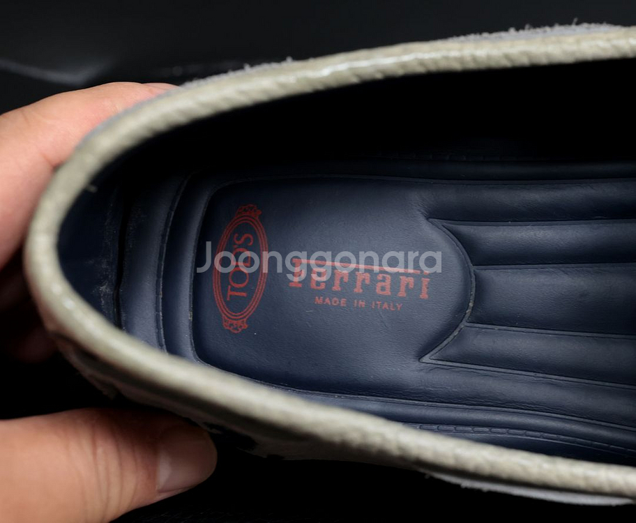 브랜드: TOD’S × Ferrari 콜라보 드라이빙 슈즈 원산지: Made in Italy 사이즈 표기: 남성용 7 (US 7 / EU 40 / 약 260mm) 외관: 스웨이드 + 그레인드 레더 콤비네이션, 사이드에 Ferrari 로고 자수, TOD’S 특유의 고무 스터드 아웃솔 상태: 전체적으로 양호, 사용감 거의 없음 실측 사이즈 길이: 약 27cm 발볼: 약 9.5cm 권장 발사이즈: 260~265mm 착용자 권장 평소 250~255mm 착용자 → 루즈하게 착용 가능 TOD’S만의 이탈리아 장인 수제작 상단: 천연 소가죽 (그레인드 텍스처) 측면: 스웨이드 디테일 & Ferrari 로고 자수 밑창: TOD’S 고무 스터드 아웃솔 → 드라이빙 슈즈 특유의 그립감 가볍고 유연한 착화감, 간절기에 특히 적합 이건 흔~치 않은 토즈(TOD’S)랑 페라리(Ferrari) 콜라보 한정판 드라이빙 슈즈여유. 이태리 수제작이라 가죽 질감부터 다르고, 옆쪽에 페라리 로고 자수 딱~ 들어가 있응게 신고 다니믄 시선 확 끌어당기지유. 차 좋아하는 분들한테는 로망 같은 신발이지유.