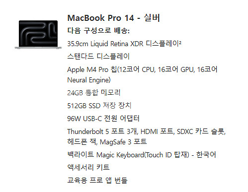 맥북 프로 14인치 실버 모델입니다 이번 4월에 구매했구요 사용은 거의 안 했습니다 구매했었을 때 구성품 그대로구요 액정클리너도 같이 드리겠습니다 애케플 적용중입니다 - Apple M4 Pro 칩 (12코어 CPU, 16코어 GPU, 16코어 Neural Engine) - 24GB 통합 메모리 - 512GB SSD 저장 장치 - 35.9cm Liquid Retina XDR 디스플레이 - 96W USB-C 전원 어댑터 - Thunderbolt 5 포트 3개, HDMI 포트, SDXC 카드 슬롯 - 백라이트 Magic Keyboard (Touch ID 탑재) - 한국어 뛰어난 성능과 휴대성을 자랑합니다 할부 가능하시구요 쿨거 네고도 가능합니다!