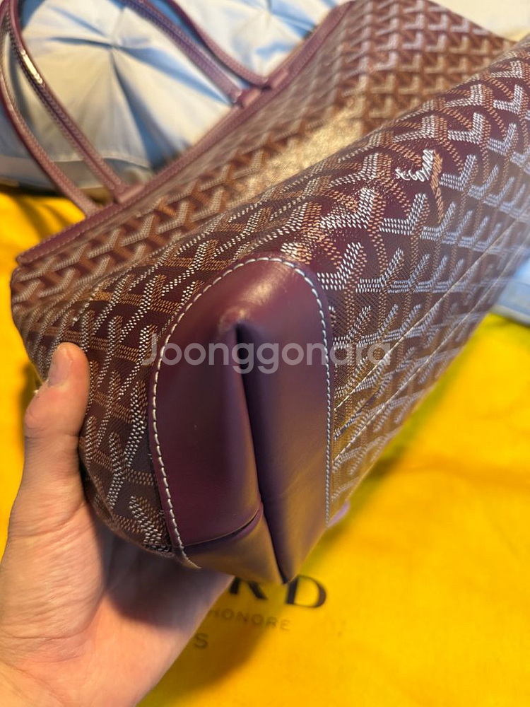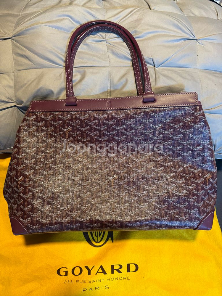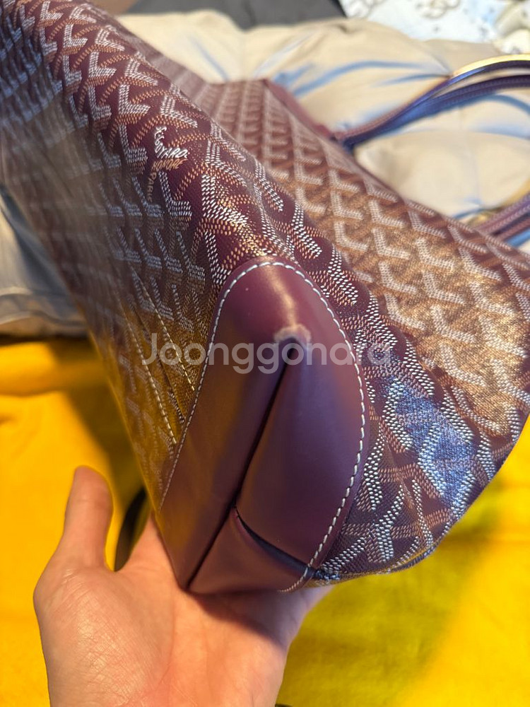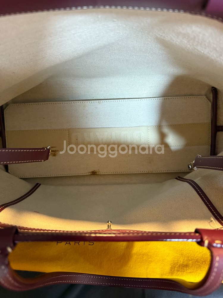 고야드 벨샤스 토트백입니다. 눈에 띄는 버건디 색상이 매력적인 제품입니다. 더스트백과 함께 보관했구요 손잡이 사용감, 양쪽 모서리 사용감, 안쪽 얼룩 제외하면 가격대비 충분히 만족하실거라고 생각합니다