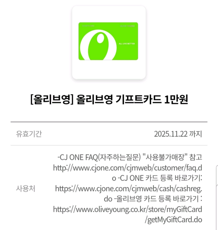 올리브영 기프트카드 1만원권입니다 유효기간은 2025년 11월 22일까지입니다
