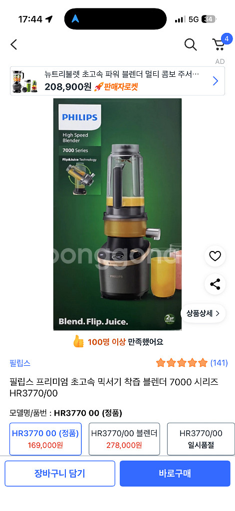개인정보(거래정보)를 주고받는 행위는 사기에 노출될 수 있으므로 즉시 중고나라로 신고해 주세요필립스 프리미엄 초고속 믹서기 착즙 블렌더 7000 시리즈 HR3770모델입니다 빠른 속도로 재료를 손쉽게 블렌딩할 수 있습니다 사용한지 2달도 되지않았고 몇번쓰지도 않았어요 박스는 없고 사용설명서와 구성제품은 모두 있습니다 환불불가