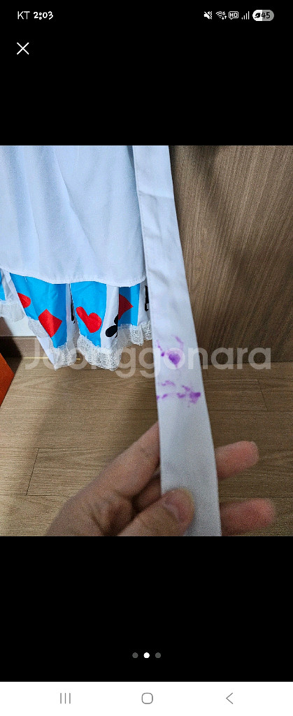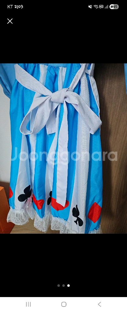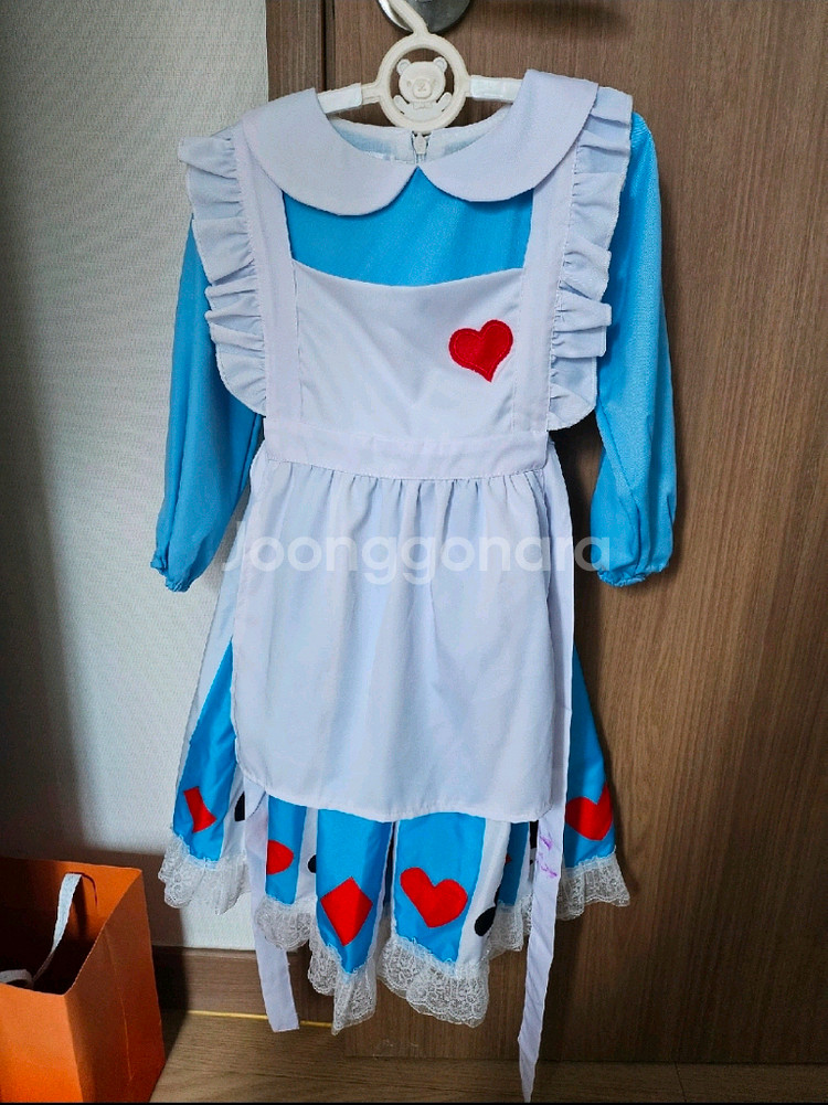이상한 나라의 앨리스 코스튬 의상입니다. 5~6세 110사이즈입니다. -전반적으로 한번밖에 입지않아서 너무 깨끗하지만 단 한군데 얼룩이 존재합니다(사진참고). 그래서 저렴하게 내놓습니다. 이부분은 뒤에 리본을 묶는 끈인데 리본을 묶음 티가 나지않아요.(마지막사진참고). 얼마뒤에 있을 할로윈이나 코스프레 행사 때 좋을 것 같아요. 다른 앨리스 코스튬보다 더 많은 무늬들덕에 더 귀여워보여요~