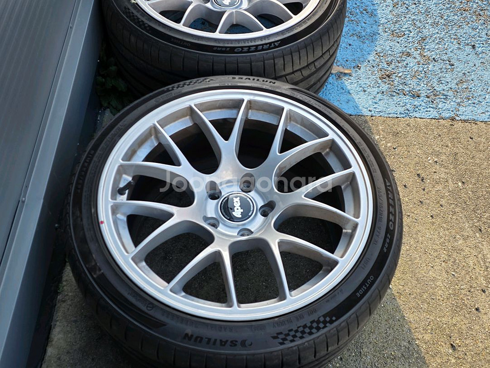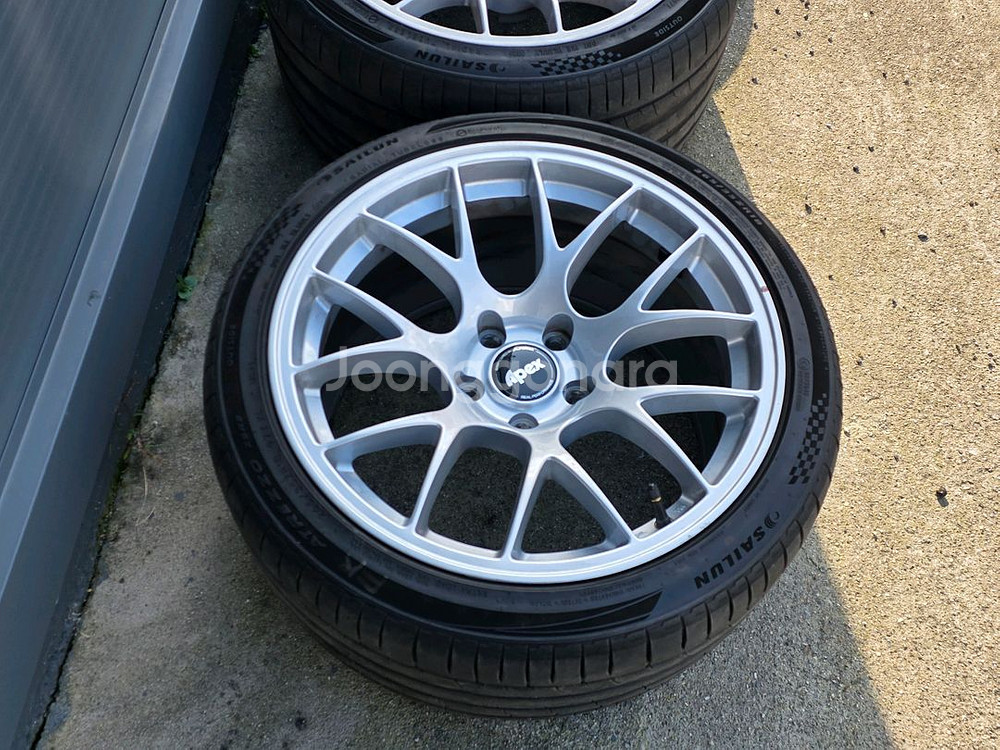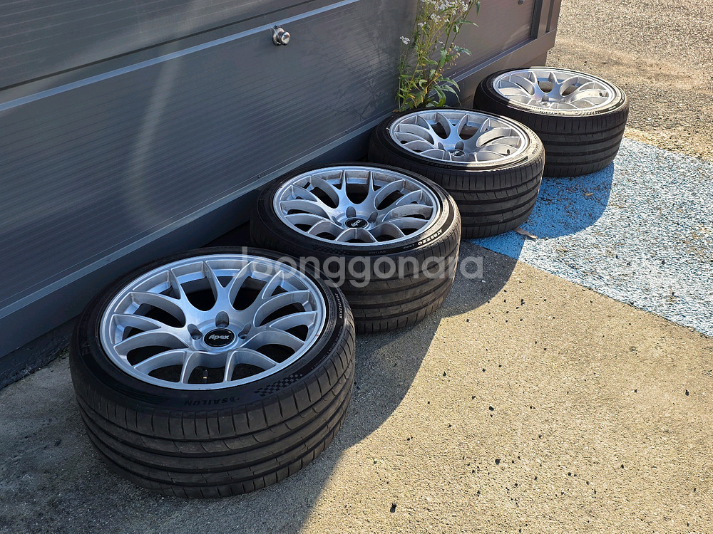 apex ec-7 정품 18인치 PCD120 5홀 10j 25 앞뒤 동일 신품 구입후 E92 M3에 사용했습니다. 타이어 사일룬 ZSR2 265 35 18 25년 3주차 타이어 포함 주차기스 없고 상태 좋습니다. 복원x 도장x 정품 상태 그대로입니다. 운행 중 돌튐이나 생활스크래치는 있을 수 있습니다. BBS로 바꿔서 판매합니다. 에버랜드 방면 직거래만 희망합니다.