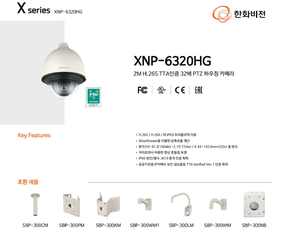 한화비전 XNP-6320HG 2M H.265 TTA인증 32배 PTZ 하우징 카메라 주요특징 • H.265 / H.264 / MJPEG 트리플코덱 지원 • WiseStream을 이용한 압축효율 개선 • 화각(H): 61.8°(Wide)~2.19°(Tele) / 4.44~142.6mm(32x) 줌 렌즈 • 자이로센서 이용한 영상 흔들림 보정 • IP66 방진/방수, IK10 충격 인증 획득 • 공공기관용 IP카메라 보안 성능품질 TTA Verified Ver.1 인증 획득 금액은 세별도 100만원 / 포함 110만원 2대 보유 재고를 보유하고 있는데 SPEC에 일부 차이가 있어서 판매가 안되고 재고로 보유중에 있습니다. 네고 가능하며 제품은 박스만 개봉한 상태입니다.