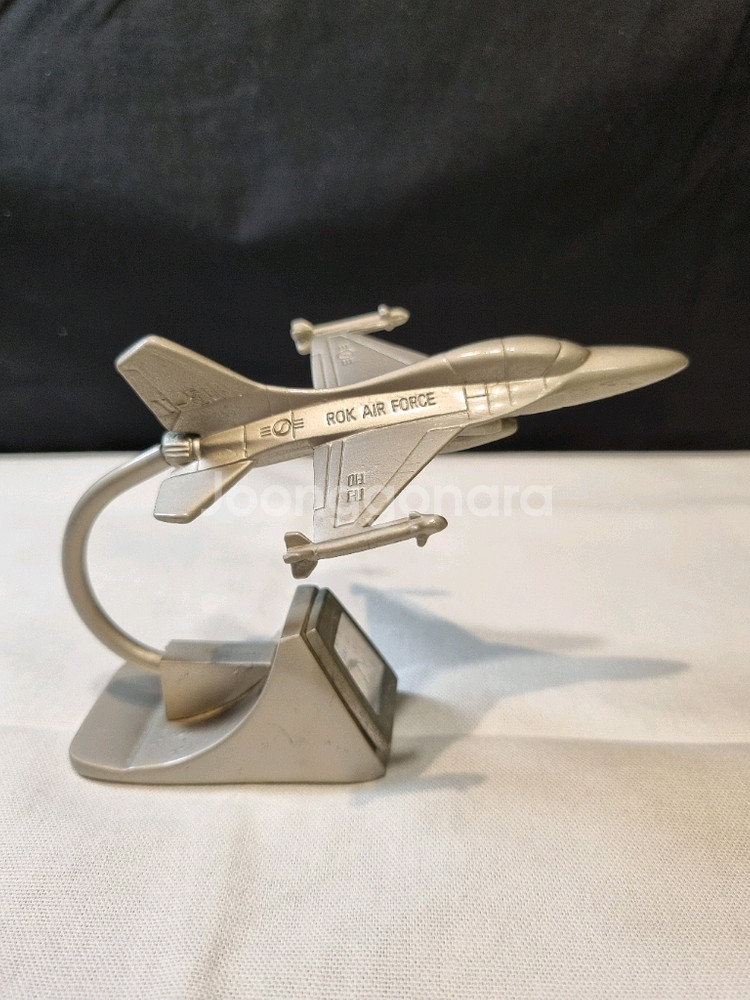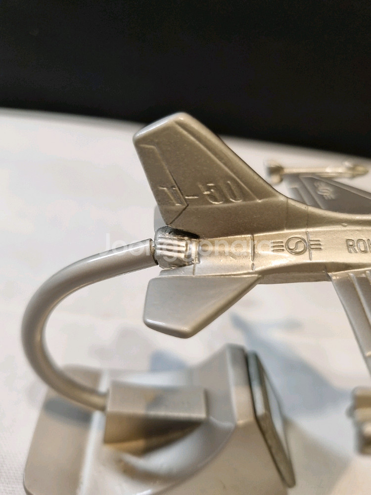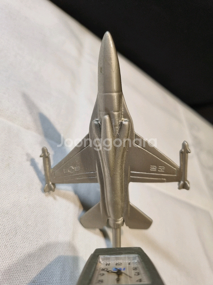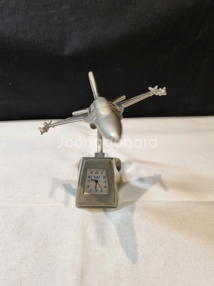 KAI 대한민국 공군 T-50 모형 전투기 입니다. 시계 기능은 잘 모르겠지만 건전지는 교환 하셔야 알수 있습니다. 상태는 사진과 같습니다. 크기는 ( 1번 사진 기준. ) 가로. 13cm 세로. 8cm 높이. 8.5cm. 입니다. ㅡㅡㅡㅡㅡ