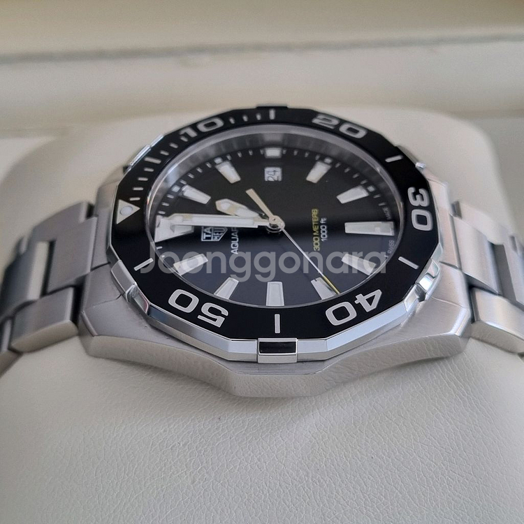 태그호이어 아쿠아레이서 쿼츠 모델로 신형이며 가격,디자인 모두 합리적이라 태그호이어에서 가장 인기가 많은 모델 입니다. 블랙 다이얼에 대형 야광 인덱스가 있고 단방향 회전 베젤에 오버사이즈 아라비아 숫자가 있는 정교한 쿼츠 시계입니다. 베젤은 강철과 알루미늄으로 만들어 졌고 브러시 처리 및 광택 처리된 41mm 스틸 케이스에는 6개의 스터드가 장착 되어 있어 다이빙 장갑을 끼고도 쉽게 다룰 수 있습니다 . 가시성을 위해 사파이어 크리스탈 내부는 반사 방지 처리되어 있습니다. 통합된 다이버 익스텐션을 사용하면 스틸 브레이슬릿을 슈트 위에 착용할 수 있습니다. 완벽한 방수 및 충격 방지 기능을 갖춘 진정한 다이빙 워치입니다. 이 모델은 베젤이 스틸과 알루미늄 두가지 로 나오는데 검판이나 청판으로 나오는 알루미늄이 스틸 베젤 보다 앞도적으로 인기가 많습니다. 쿼츠라 관리,유리비 저렴하고 충격이나 기타 고장 위험이 적어 사회 초년생들이나 자주 시계를 착용하지 않는 분들에게 적합 합니다. 그리고 동양인들 손목둘레가 17~18cm라 41mm가 가장 저스트 하기 때문에 많이들 이 사이즈를 찾고 리셀도 잘되고 있습니다. 43mm는 손목둘레 19cm 이상인 손목이 아주 두꺼운 분들에게 적당한것 같습니다 시계가 많은 분이 소장했던 시계라 실착 많지 않아 상태 아주 좋습니다. 그리고 2025년 10월 24일 서비스 센타와 동일한 베터리로 교체까지 해놓아서 앞으로 2년은 돈 들어갈 일 없을겁니다. 고민하는 순간 팔리고 없으니 빠른 초이스 해주세요. 모델번호 - WAY111A.BA0928 상태 - 새제품 대비 94% 사이즈 - 41mm 무브 - 쿼츠 리테일가 - 291만원 구입시기 - 2017년 구입한곳 - 국내백화점 구성품 - 박스,보증서,책자,여분링크