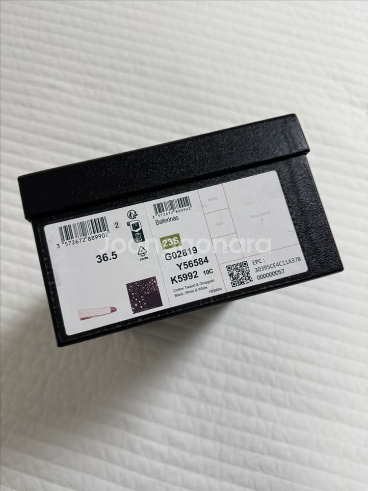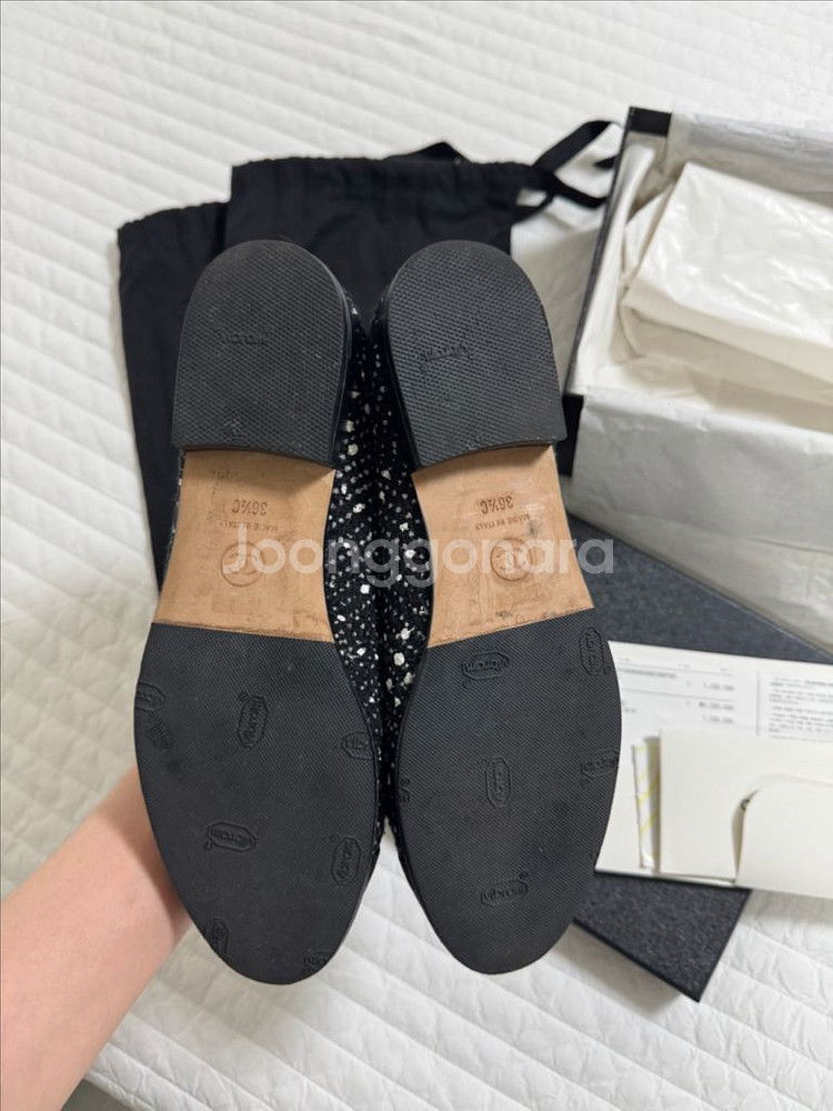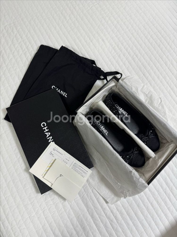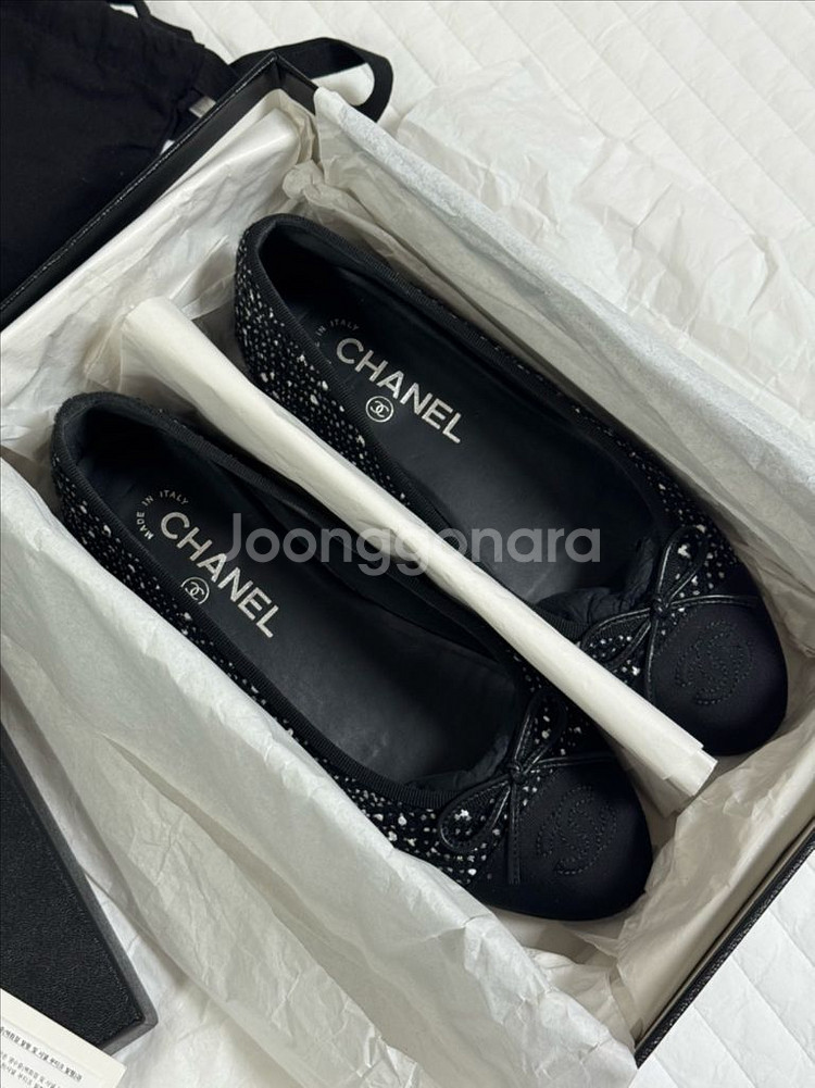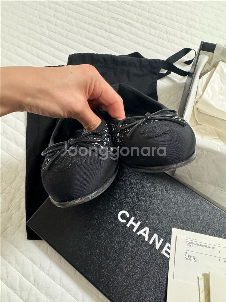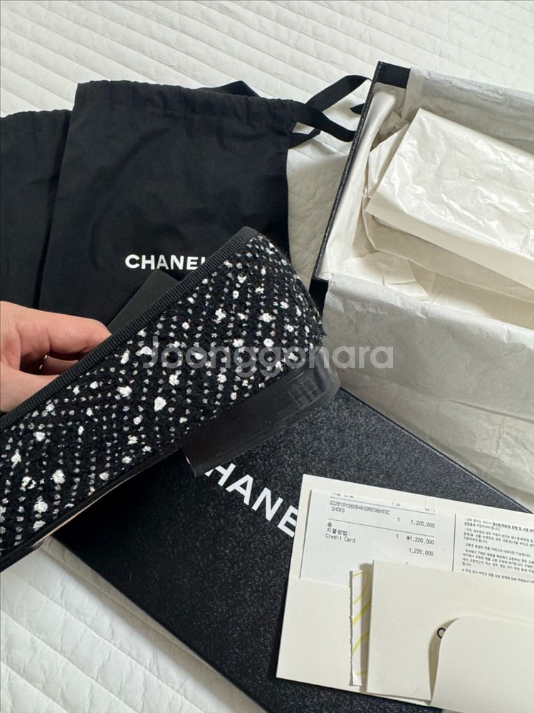샤넬 발레리나 플랫 슈즈, 235 사이즈 입니다. 블랙+실버+화이트 트위드 소재로 고급스럽고 은은하게 포인트가 되는 디자인 이에요. 총 세 번 정도만 신어서 새것처럼 깨끗한 상태이고, 바닥 보강도 되어 있어서 바로 편하게 착용 하실 수 있습니다. 구성품은 정품 박스, 더스트백 , 구매 영수증 모두 함께 드리며 봄,가을,겨울에 모두 사용 할수 있는 패션 아이템이에요.