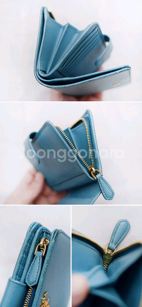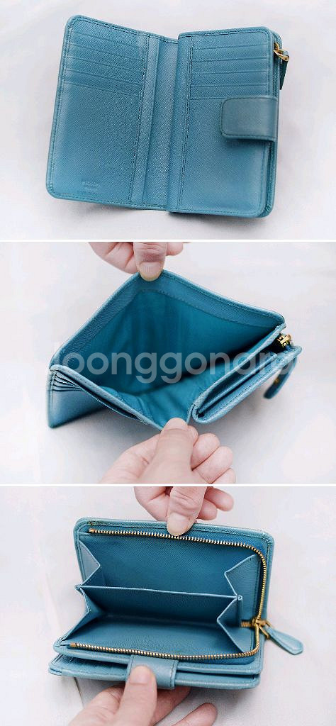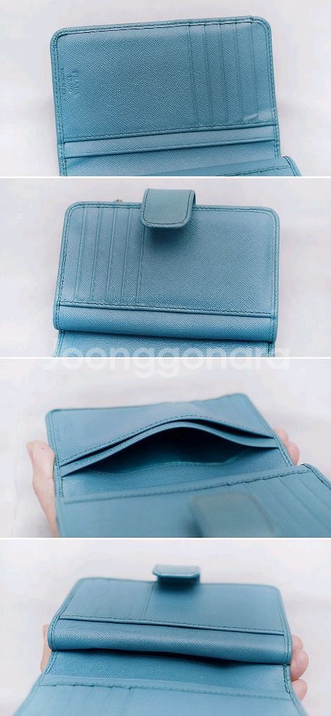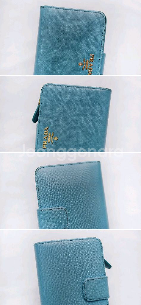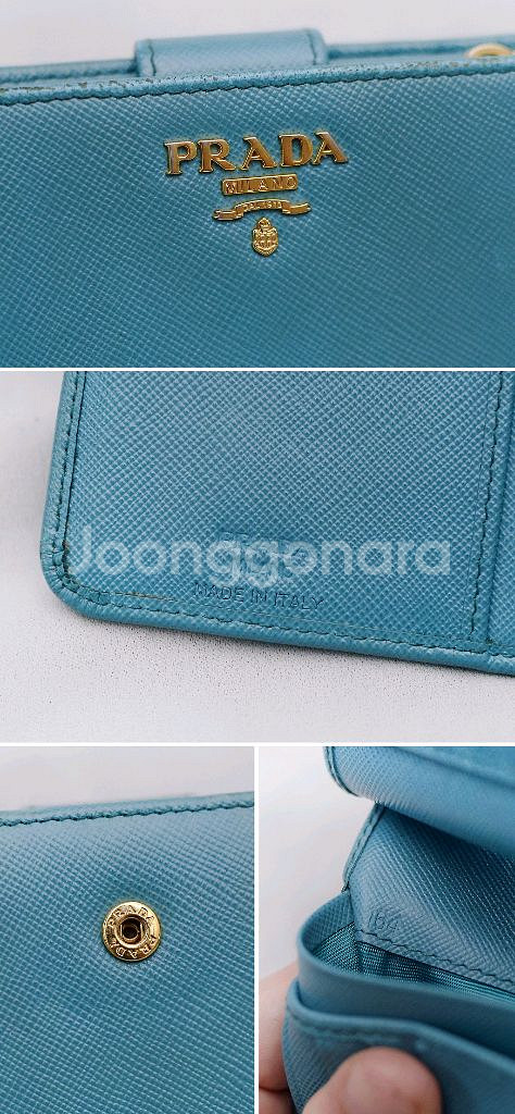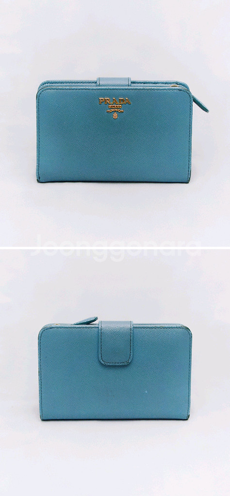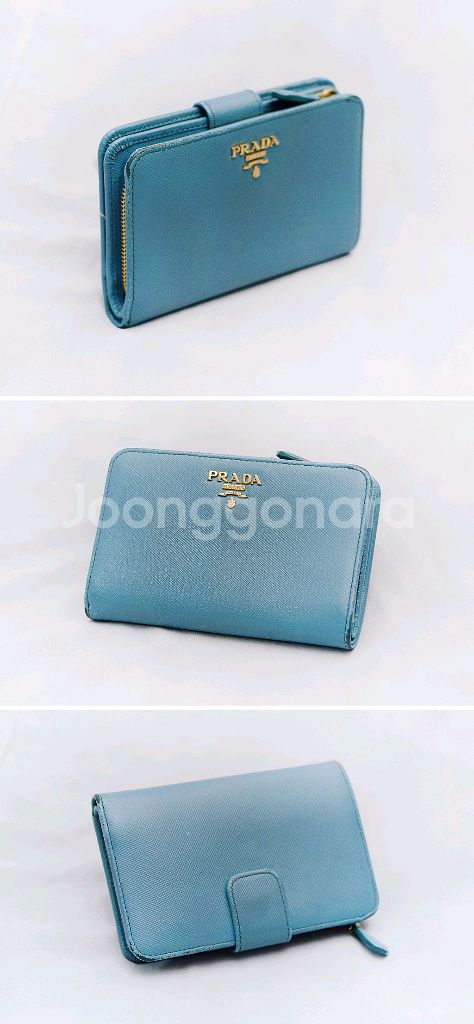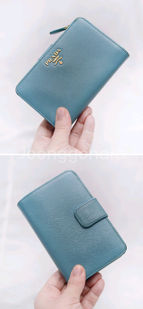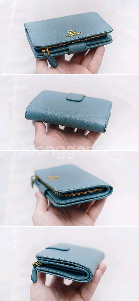 프라다 (PRADA) 사피아노 메탈 금장 로고 지퍼포켓 중지갑 당연히 정품 프라다 사피아노 레더 금장 메탈로고 지퍼 포켓 중지갑 입니다. 스냅 버튼 오픈되는 메인 포켓부와 지퍼 오픈되는 퀵포켓부 나뉘어져 있어 수납성 좋으면서도 실용성 높은 프라다 중지갑으로 비취.에메랄드 컬러 (보야지 블루)에 프라다 특유의 탄탄한 사피아노 엠보 가죽 소재와 금장 프라다 레터링 로고 되어있어 화사하고 고급스러운 스타일 좋습니다. 메인 수납부에 양쪽에 5개씩 총 10개의 카드슬롯 3개의 히든 슬롯 넉넉한 깊이의 지폐슬롯 있어 뒤쪽 지퍼 오픈 퀵포켓 부분도 접이식 2포켓으로 되어있어 명함이나 자주 사용하는 카드.동전등 편하게 넣고 쓰기 좋습니다. 끝단 엣지 부분 약간의 벗겨짐등 자연스러운 사용감 정도 있으나 다른 지갑들 많아 돌려가며 쓰는 편이라 찢김.뜯김등 눈에 띄는 큰 파손.훼손없이 상태 아직 양호합니다. 개인 중고 거래 특성상 교환.환불 불가 직거래 장위동 원천 주유소 인근에서 가능 택배거래시 입금 확인 후 택배 접수하고 송장 사진 보내드립니다. 연락처 ㅇ1ㅇ-3ㅇ23-ㅇ987 모르는 번호 잘 안 받으니 문자 주세요