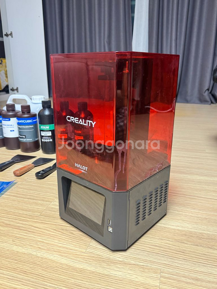 3D 프린터 CREALITY HALOT ONE +레진 등 판매합니다. 2023년에 구매하여서 1년 쓰다가 안써서 판매합니다. 구성은 프린터 본체+ 레진+이소프로필 에탄올+밀대+플레이트+베드 입니다. 레진은 사용하다가 남은 것들이며 보통 FULL에서 0.5병 정도 있습니다. 이소프로필 에탄올을 0.5리터 정도입니다. 플레이트와 베드는 교체하려고 사서 안쓴것들입니다. 그 외에 본체, 밀대 등은 전부 사용하던 것이라 사용감 있으며 본체에는 레진 자국이나, 테이프 흔적이 있습니다. 자잘하게 사용감은 존재하며, 직거래는 남성역/이수역에서 가능합니다.