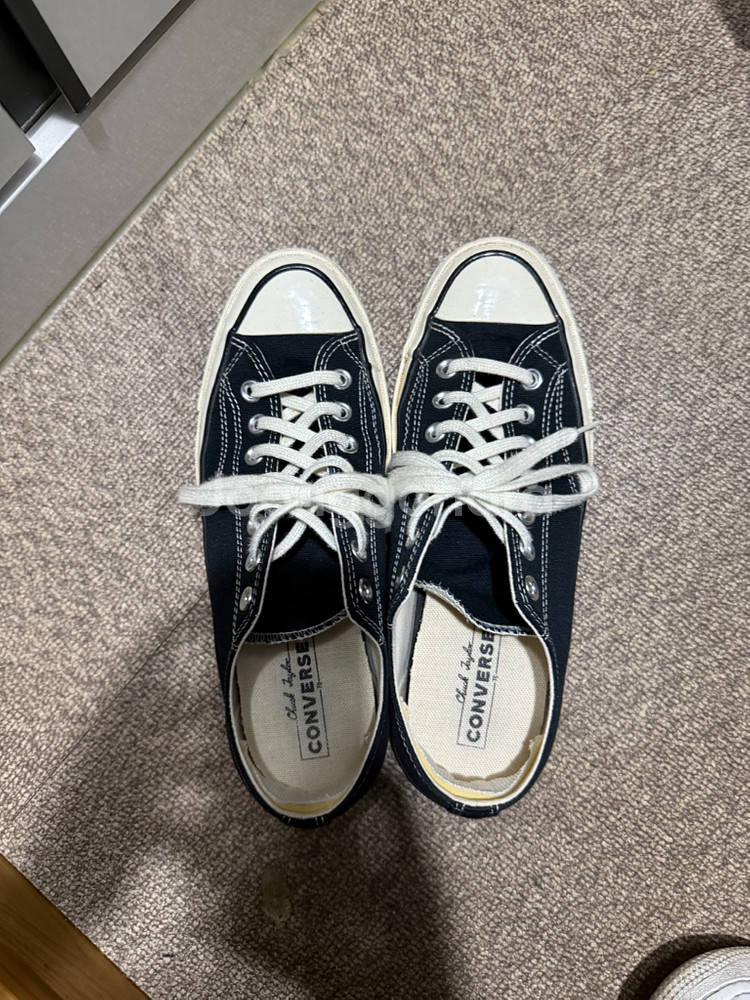 컨버스 척테일러 70s 블랙 색상입니다 밑창 살짝 닳았지만 실착 5회 미만 이고 안 신어서 판매 합니다. 전체적으로 깔끔합니다. 어떤 옷에도 잘 어울리는 디자인이에요 택배 거래도 가능합니다 배송비는 별도입니당