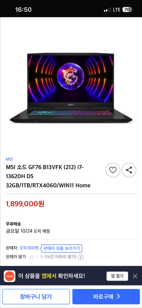 MODEL : MSI 소드 GF76 B13VFK (212) CPU : i7-13620H D5 RAM : 32GB SSD : 1TB GPU: RTX4060 8MB OS : WIN11 Home 25.10.03 개봉후 2일 전원만 켠후 다시 재 포장 보관중이며 컨디션 100% 보장 합니다 구매가 대비 사용감 거의 없이 상태 매우 양호하며, 박스도 모두 보관 중입니다. 직거래 : 포항 및 그 인근지역 택배시 : 물건 받았던 그 택배 포장 그대로 보내 드립니다 구매처 : https://www.coupang.com/vp/products/8966074987?vendorItemId=*********** 상품 정보 내 개인정보는 자동 보호됩니다. 안심결제로 안전하게 거래하세요.