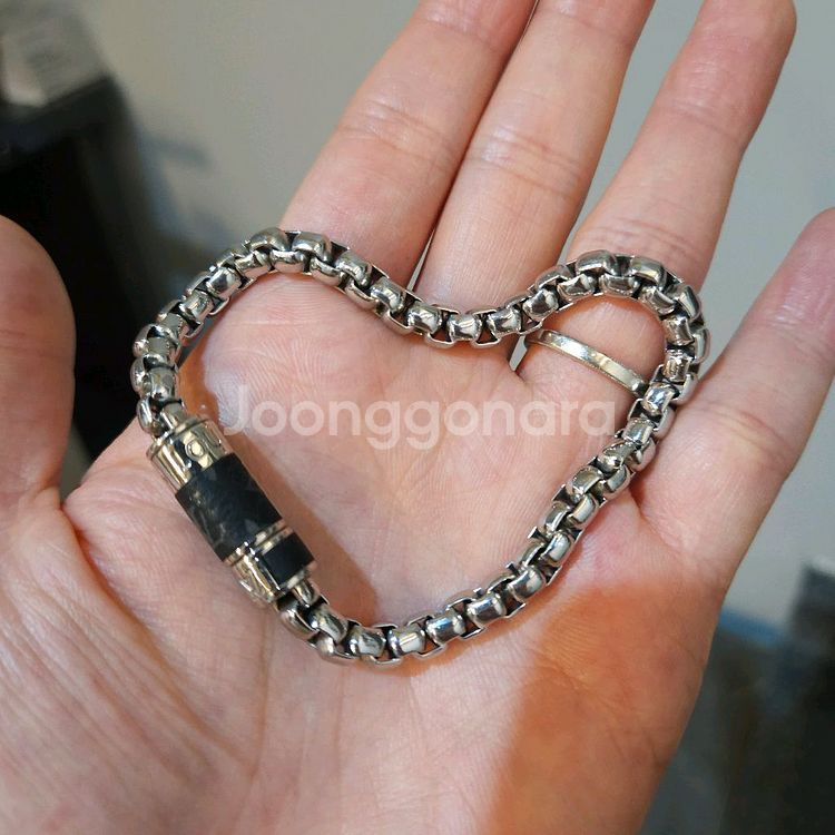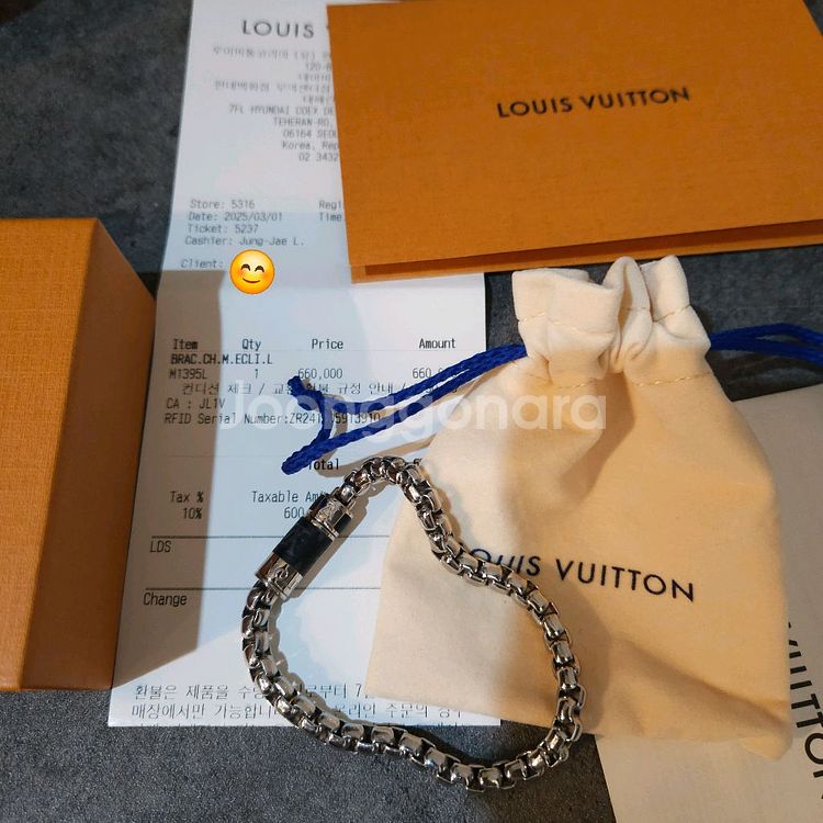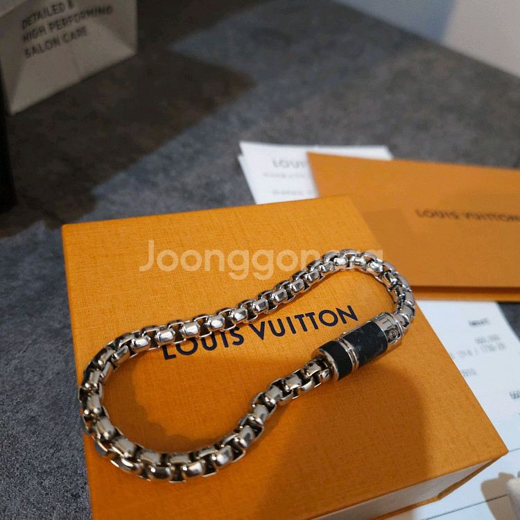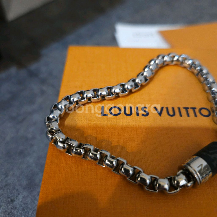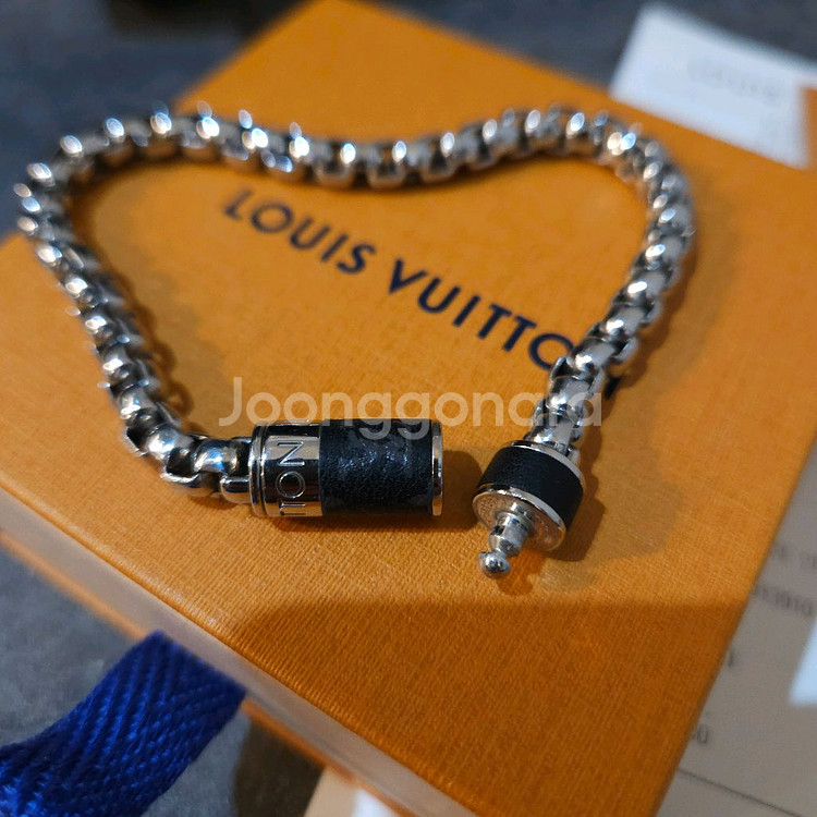 루이비통 체인 링크 팔찌입니다. 실버 색상이고 블랙 이클립스 포인트가 있습니다. 보증서까지 있는 정품이니 안심하고 구매하세요! 2025년 구매 L사이즈 21센치 (M,L사이즈중 큰사이즈) 상태-생활기스조금