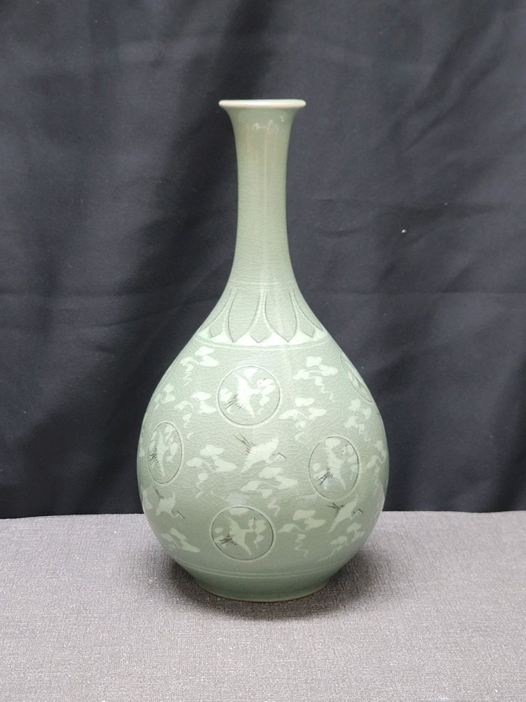 높이 31센치 조경요 조경수 선생의 초기 작품 주병입니다. 은은한 청자 바탕에 흑백 상감 기법으로 구름과 학이 수놓아져 있습니다. 여주가마 초창기 기물로 옛 방식으로 제재된 상급 기물입니다. 택배비는 무료로 저희가 부담합니다. 도서, 제주도, 대형기물, 퀵이나 용달이 필요한 기물은 별도 협의해 주세요.