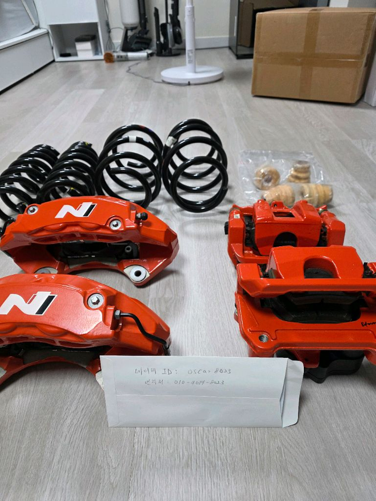 제품명 : 아이오닉5N 순정 4P 브레이크 캘리퍼(+패드), 스프링 일괄 지역 : 충북 증평 초중리 최초 구입일 또는 사용기간 : 5월 중순, 약7500Km 판매자 성명, 연락처 : 오세현, 010-4영9사-8영2삼 제품 상세 설명 : - 순정4P 브레이크 앞 (패드포함) ((뒷 브레이크 판매완료)) - 순정 스프링 앞, 뒤 - 부피 및 무게가 있어 직거래 희망합니다.