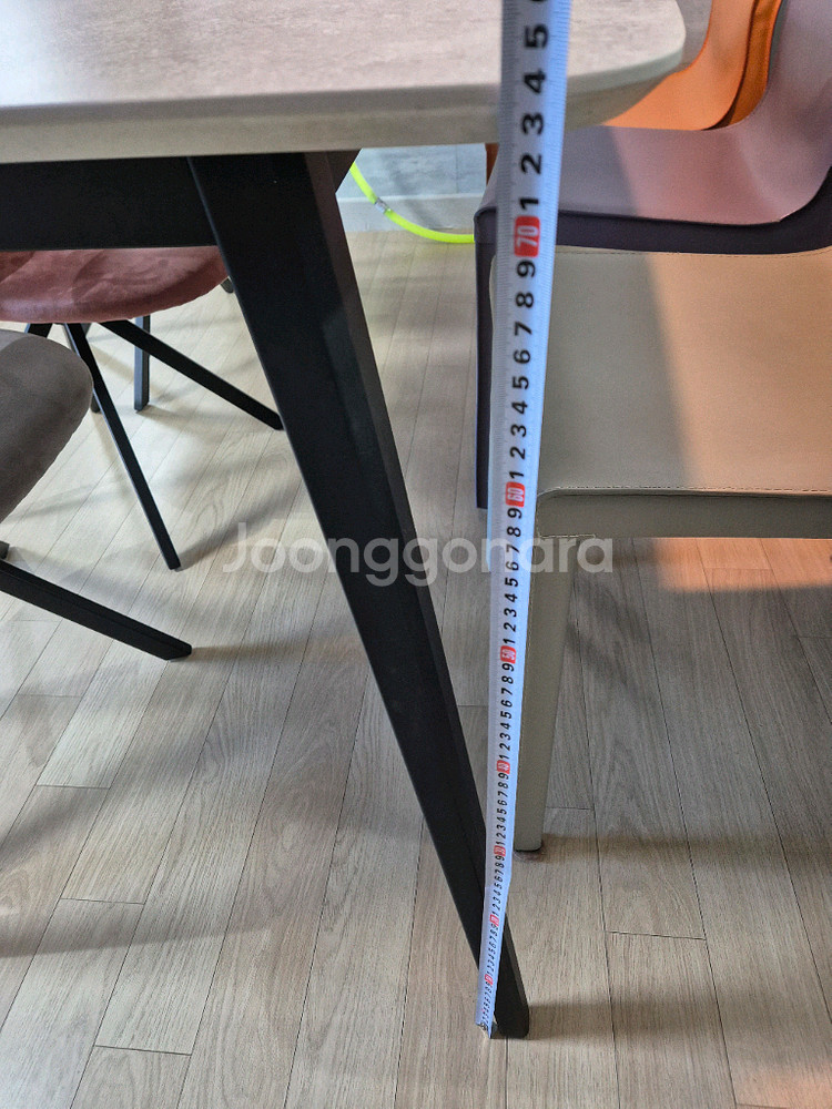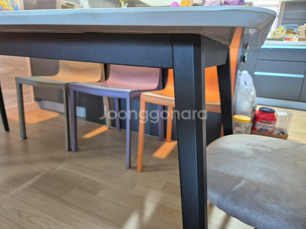 2019년에 의자 포함 132만원에 구매한 세라믹 6인용 식탁 테이블과 의자 세트입니다. - 두껍고 무거워 흔들림 없는 상판과 검정색 다리가 특징입니다. - 테이블 길이 가로 약 180cm, 세로 약 84cm, 높이 약 73cm, 상판 두께 약 2cm입니다. 상판 전혀 손상된 곳 없이 깨끗한 편이며 여러 세라믹 상판 중 얇은 상판이 아닌 두꺼운 상판에 속하는 세라믹 상판 입니다. 의자는 얼룩이 있는곳도 있고 사용감있지만 전체적으로 사용에는 문제 없습니다. 상판과 다리 부분이 뽁뽁이로 연결되어 있지만 상판자체가 무거워서 흔들림 없이 튼튼합니다. 직접오셔서 상태 보시구 가져가시면 됩니다. 특히 상판이 무겁기 때문에 두명 이상이 오셔서 들고가셔야 하며 아파트 주차장으로 가지고 내려가실땐 저도 같이 옮겨드릴 수는 있습니다. 용달 등의 방법으로 가져가셔야할 듯 합니다. 의자 6개 포함 입니다. 지역은 전북 무주읍내 입니다.