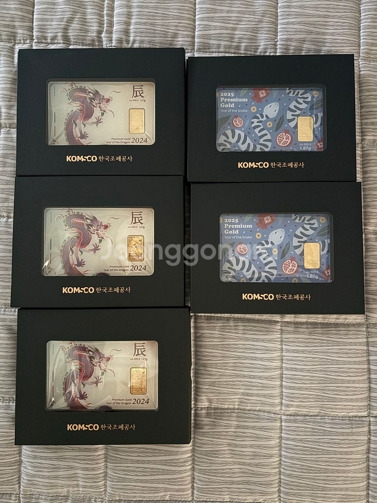 판매제품 1. 한국조폐공사 발행 24년 갑진년 용의 해 카드형 골드(1.87g) -2개(1개 판매완료) 2. 한국조폐공사 발행 25년 을사년 뱀의 해 카드형 골드(1.87g) -1개(1개 판매완료) 판매금액 : 개당 470,000원 택배비 : 5,000원(직거래시 대구 달서구 유천동) 제품 특성상 구입 후 환불/교환 불가하오니 신중히 고민 후 구입 바랍니다. 네고 문의 자제 부탁드립니다.