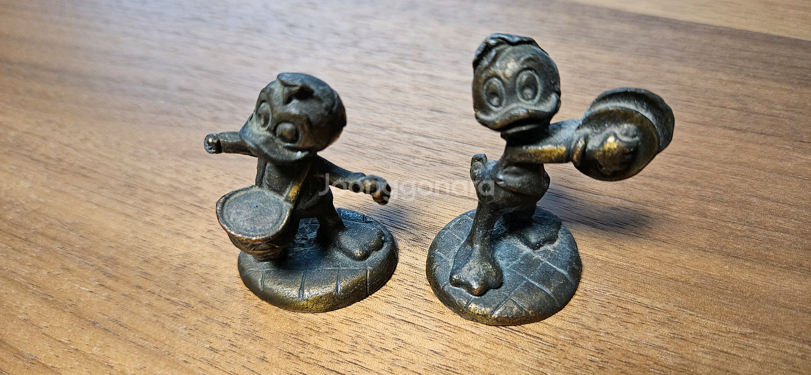 도날드 덕 밴드 피규어 2개입니다 빈티지한 느낌의 미니어처 장식품입니다 악기를 연주하는 모습이 귀엽습니다 재질이 청동인지는 확실치 않고 짐작입니다 크기 비교하시라고 손바닥 사진과 같이 올렸습니다