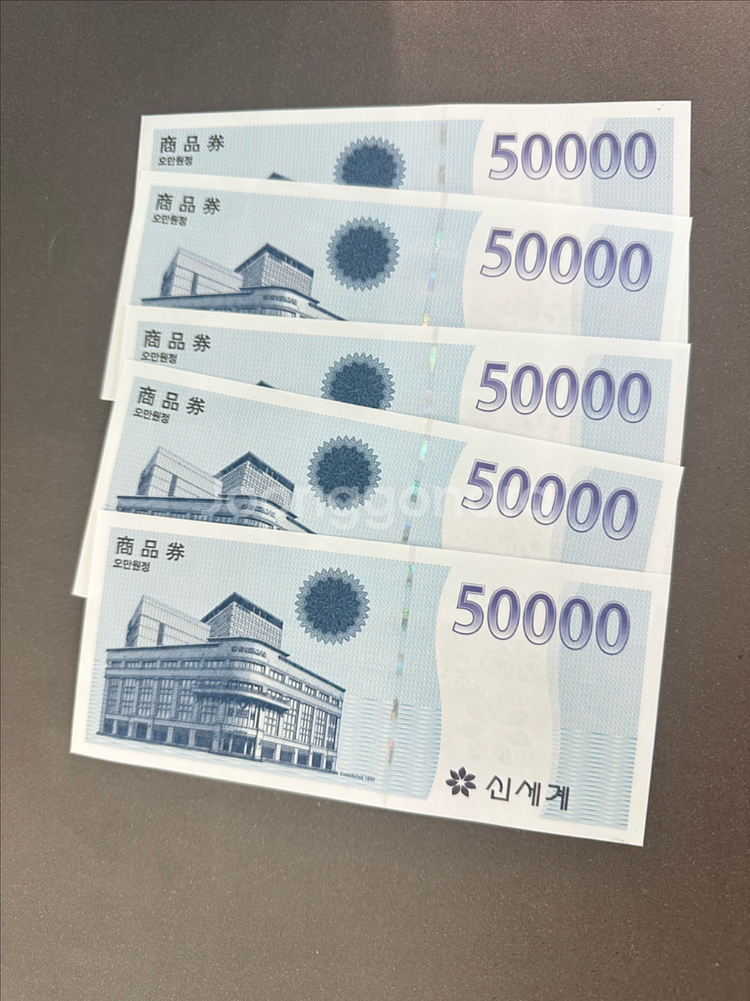 신세계 상품권 오만원권 판매합니다 지 류 형태 입니다. 장당 48,000 원에 판매합니다 총 다섯 장 판매합니다. 평택 고덕동 직거래 택배는 착불 입니다
