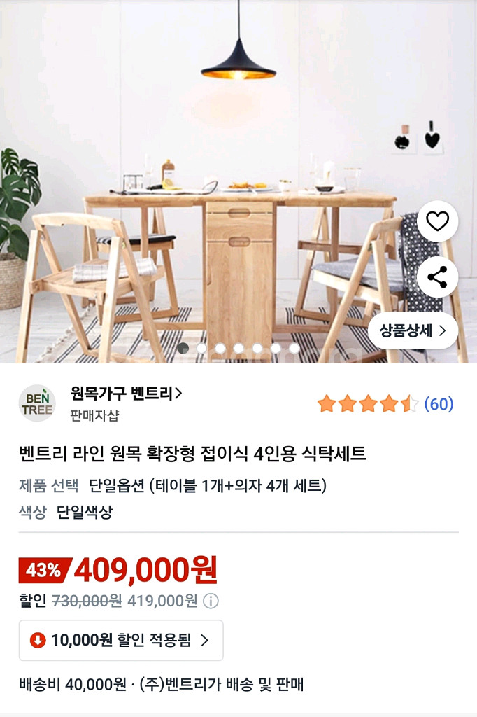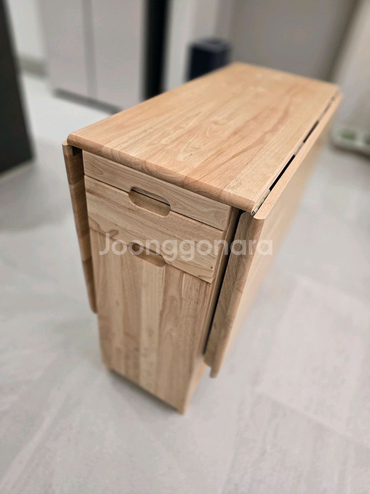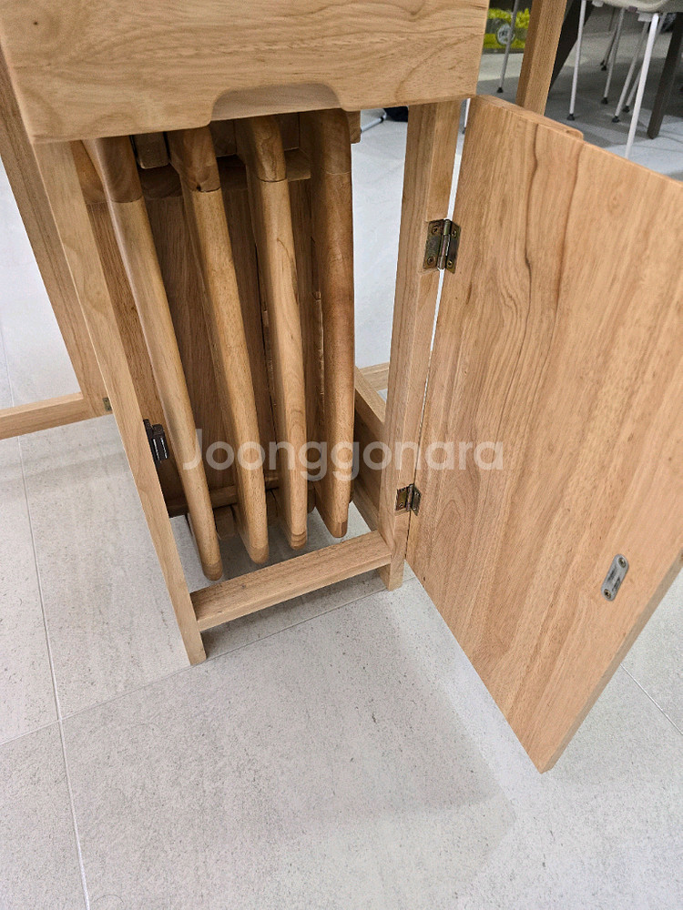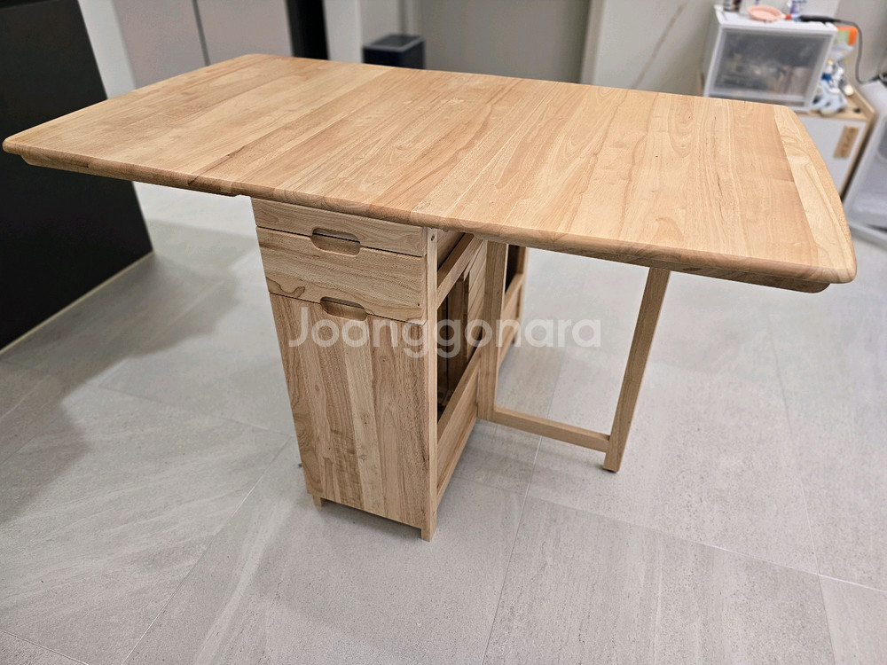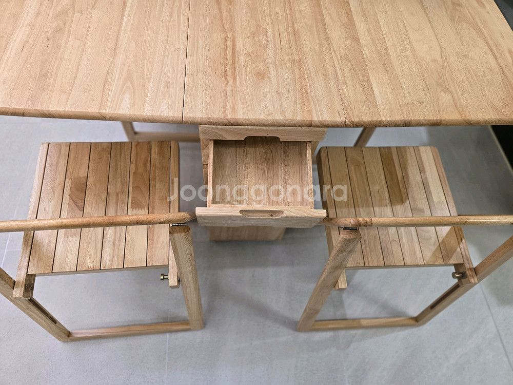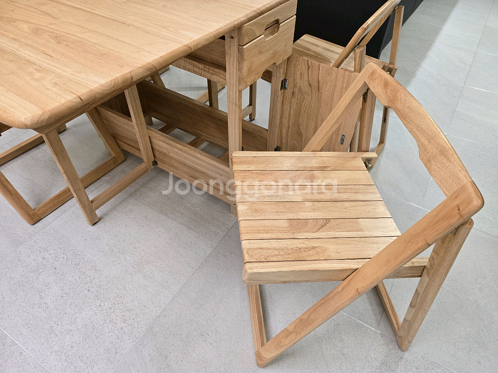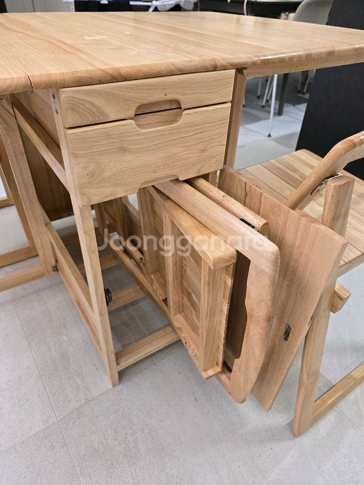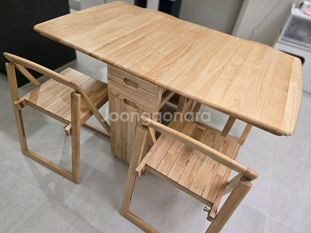 원목으로 만들어진 접이식 식탁과 의자 세트입니다 좁은 공간에서도 활용하기 좋고, 필요에 따라 펼쳐서 사용할 수 있습니다. 원목의 따뜻한 느낌이 집안 분위기를 더욱 아늑하게 만들어 줍니다. 거의 사용하지 않았습니다.