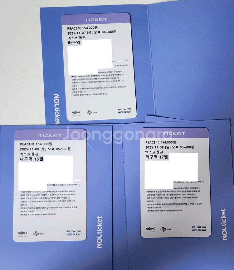 11월 7일 6시 PEACE - 라구역 통로쪽 단석 11월 8일 5시 PEACE - 나구역 15열 단석 11월 9일 5시 PEACE - 라구역 17열 단석 장당 가격으로 단석 판매중입니다 게시글에서 바로 안심결제 해주시면 됩니다