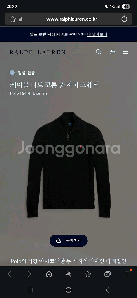 [탭제거새상품] 폴로 케이블 니트 코튼 풀 지퍼 스웨터 / 블랙 / S (95) 사이즈 / 15만 / 택포 팝니다. 폴로 공홈 24.03.19 29.9에 구매 후, 미착용 보관만 하였습니다.