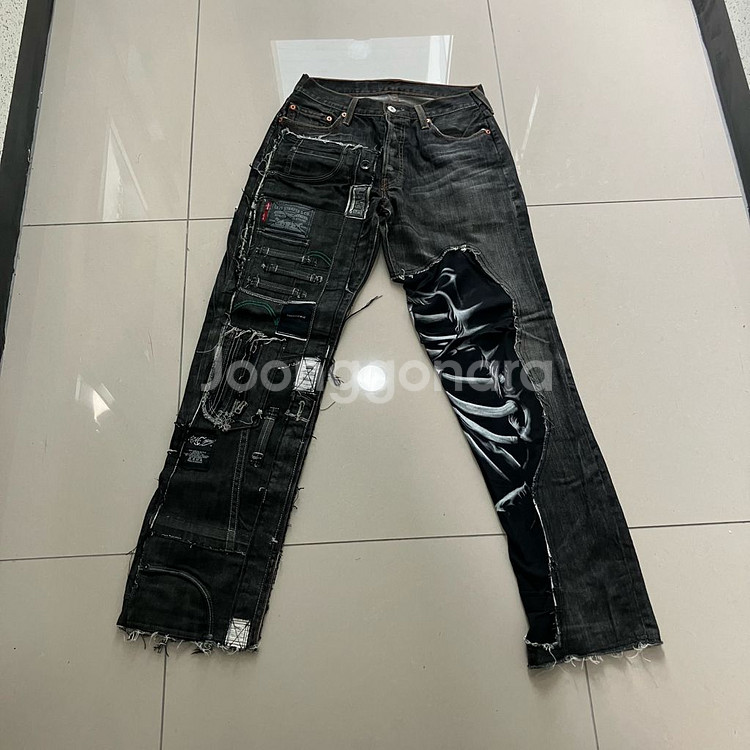 총장 107 허리 37 허벅지 30.5 밑위 27.5 밑단 21 일본 빈티지 스토어에서 구매했던 빈티지 온리원 제품입니다. 다리에 그래픽 티셔츠가 멋지게 커스텀 돼있습니다. 15키로 감량 후 사이즈가 이제 안 맞아 정말 아끼는 제품이지만 판매합니다. 많은 문의 부탁드립니다.