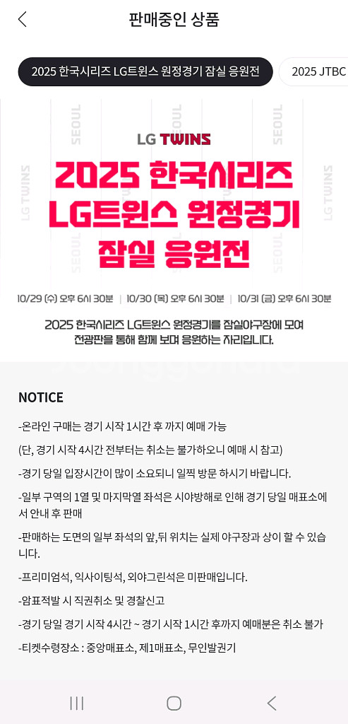 한국시리즈 5차전 잠실응원전 오렌지석 입니다 207구역 16열 183~186번이고 2연석 4연석 모두 가능하십니다!! 장당 가격 20000원 이고 구매하시면 선물하기로 보내드립니다 궁금하신건 편하게 채팅으로 문의해주세요. 2연석 남아있습니다 네고 가능