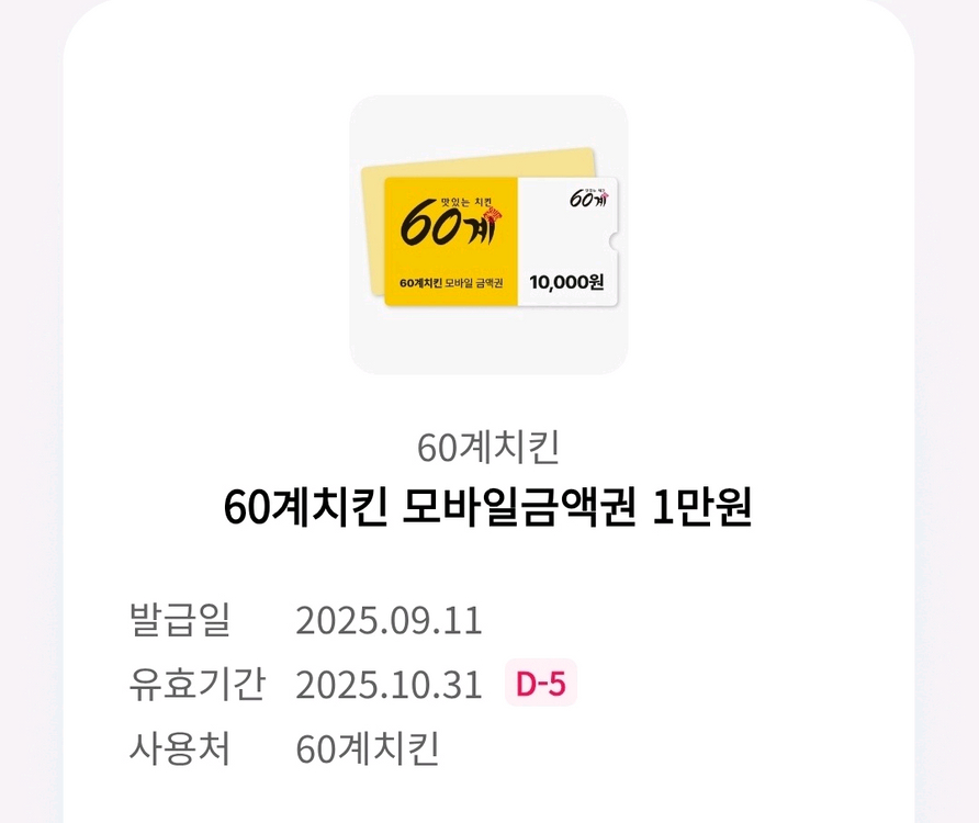 ![[판매완료] 60계치킨 모바일금액권 1만원권--0](https://img2.joongna.com/media/original/2025/10/26/1761449860783IV8_lFMJU.jpg?impolicy=resize)