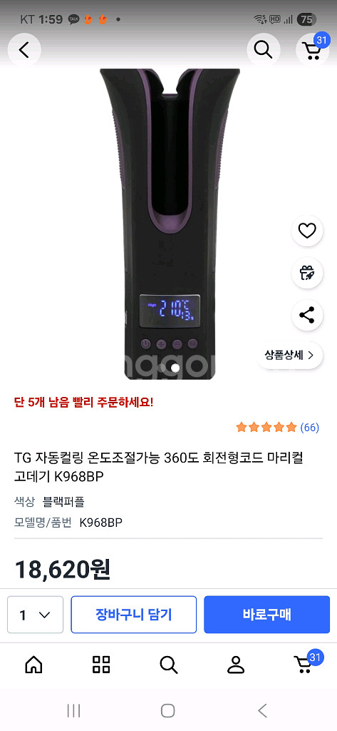 TG 자동컬링 고데기 K968BP TG 자동컬링 온도조절가능 360도 회전형코드 마리컬 고데기 K968BP 쓰기가 어려워서 몇번 쓰다가 안쓴건데 물건 정리하다 발견해서 팝니다! 작동은 잘 되구요. 박스는 없어요!