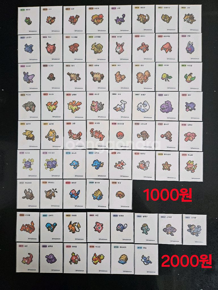 포켓몬 픽셀아트, 포켓피스 띠부씰 개별 판매합니다. 장당1000원부터 사진에 금액 적혀있어요. 모든씰 opp포장 보관중 10장 이상 거래 가능해요. 소량 구매 원할시 약간의 추가금액 있습니다. 파란색 체크표시는 품절입니다. 반값택배 일반택배 가능 택배비는 별도에요 다른 게시글에 여러가지 포켓몬 띠부씰 판매중입니다. 합배송 가능해요