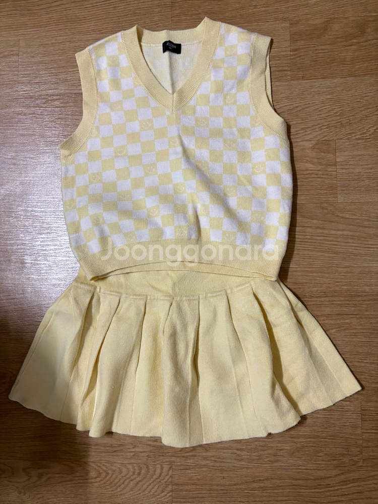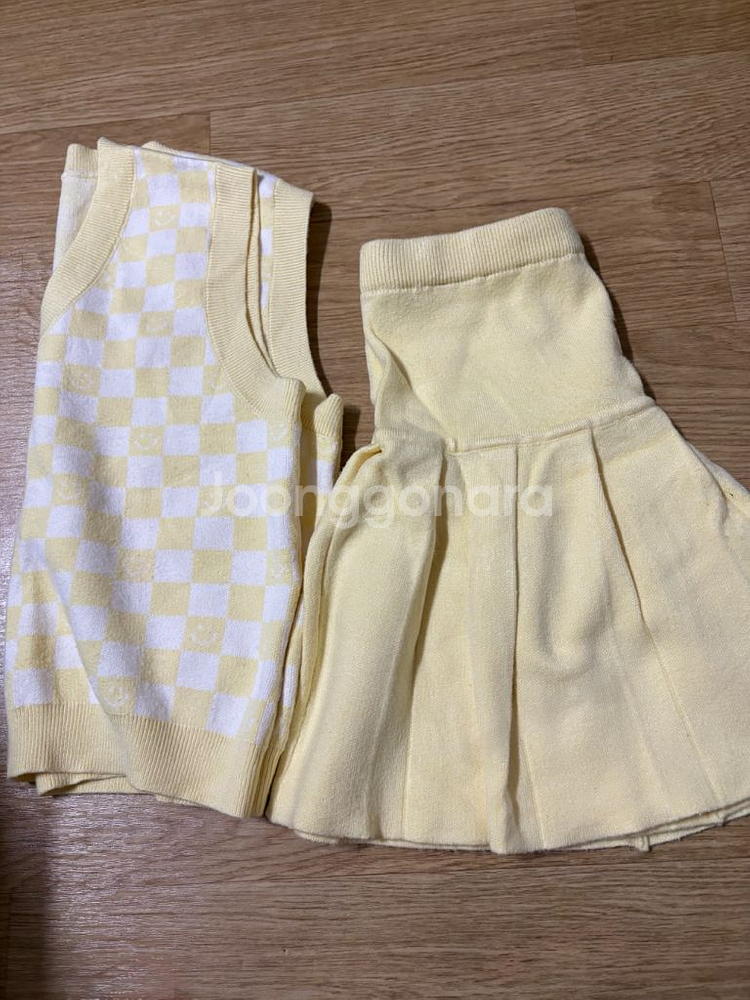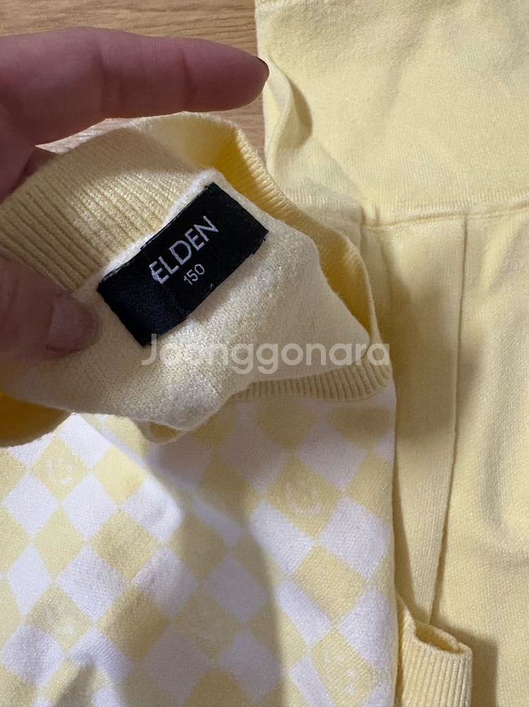 ELDEN 브랜드의 옐로우 색상 니트 상하의 세트입니다 - 사이즈는 150입니다 - 체크 패턴의 조끼와 플리츠 스커트 구성입니다 - 부드러운 니트 소재로 착용감이 좋습니다 - 밝고 화사한 옐로우 컬러가 돋보입니다 - 구매후 2번입고 작아서 못입었어요