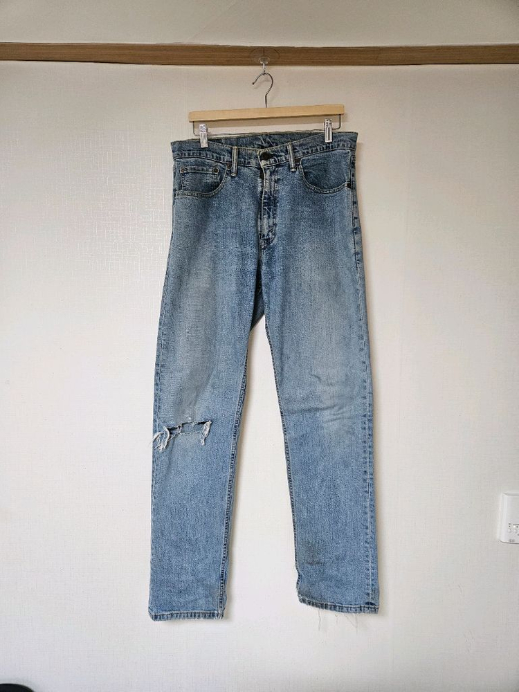 빈티지 리바이스 505 찢청바지입니다 사진은 조금 더 쨍하게 나오네요. 전체적으로 통일된 색상입니다.